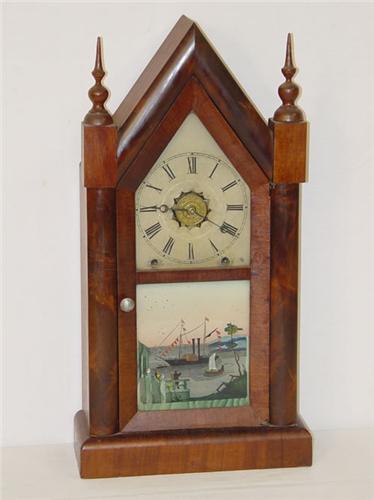 20 1/2" NEW HAVEN MAHOGANY VENEERED STEEPLE CLOCK W/ REVERSE PAINTED LOWER TABLET OF ROBERT FULTON'S STEAMSHIP CLERMONT ON THE HUDSON RIVER - 8 DAY & 30 HOUR, IMPERFECTIONS