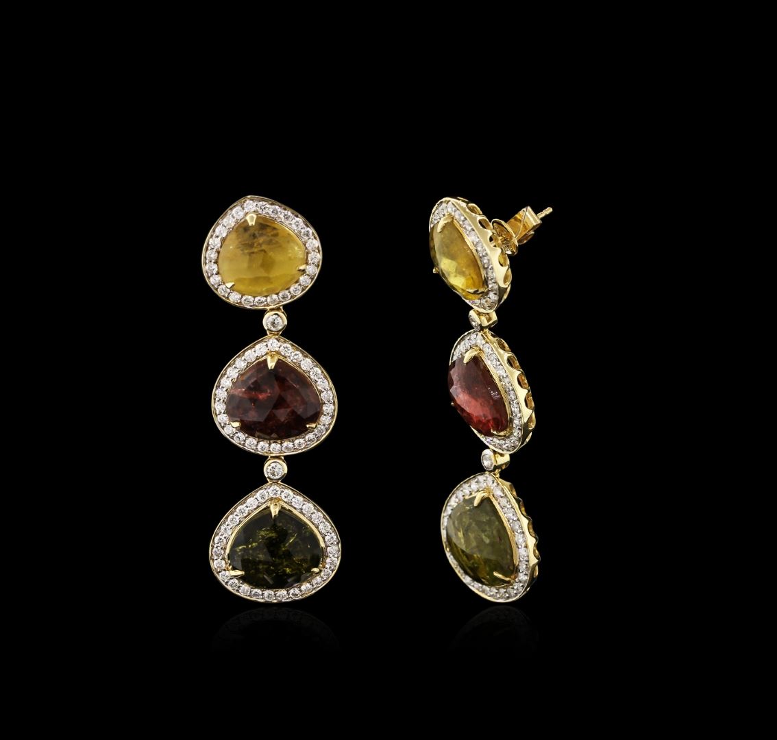 One pair electronically tested 14KT yellow gold ladies cast tourmaline and diamond earrings with friction posts with a bright polish finish. Identified with markings of "14K". Condition is new. Containing: Two prong set pear modified mixed cut natural pink tourmalines, measuring 13.50 x 12.50 x 2.30mm, approximate total weight of 4.76ct., clarity is moderately included, type II, light, very slightly grayish, reddish purple color, (GIA rP 3/3), cut is good. Four prong set pear modified mixed cut natural yellow tourmalines, measuring 13.50 x 12.50 x 2.70mm, approximate total weight of 15.39ct., clarity is moderately included, type II, light, brownish, yellow color, (GIA Y 3/3), cut is good. Four bezel set round brilliant cut diamonds, measuring 2.50 - 2.50 x 1.50mm (depth est.) approximate total weight of 4 Stones = 0.23ct. Clarity: SI-1. Color: I - J, Cut is Good. One Hundred Fifty-Four prong set round brilliant cut diamonds, measuring 1.50 - 1.50 x 0.90mm (depth est.) approximate total weight of 154 Stones = 1.89ct. Clarity: SI-1 to SI-2. Color: I - J, Cut is Good. Colored gemstones are presumed to have been subjected to commonly used enhancement processes. All diamonds and colored gemstones are graded in the mounting, unless otherwise stated. Total Weight of Colored Stones 20.15ct. Total Weight of Diamonds 2.12ct. Total Weight of Earrings 17.40 grams. GGL Appraised at $6,835.00.