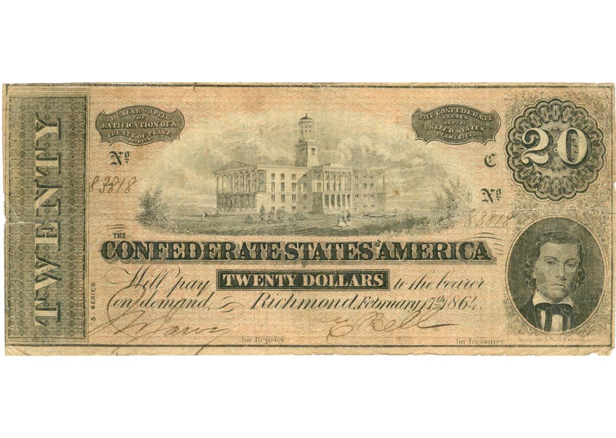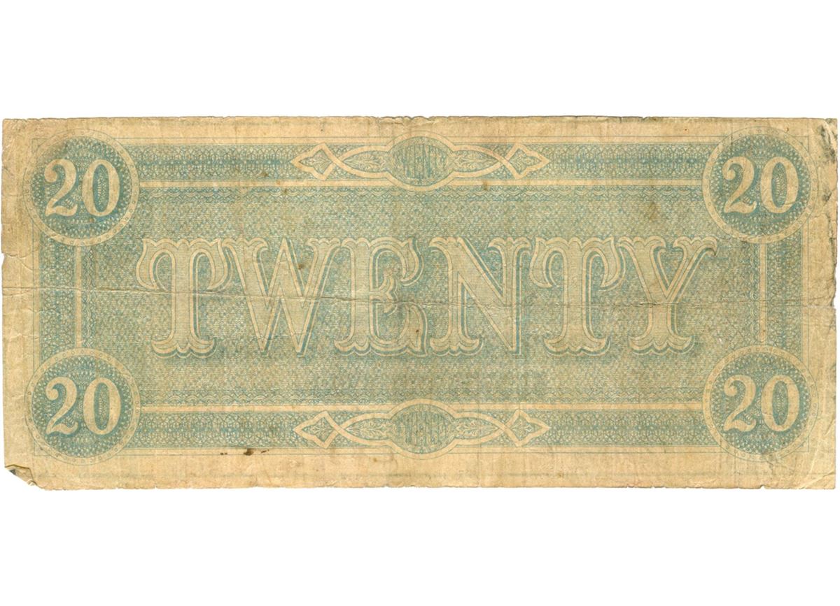 One $20 1864 Richmond Virginia Confederate States of America Large Note.