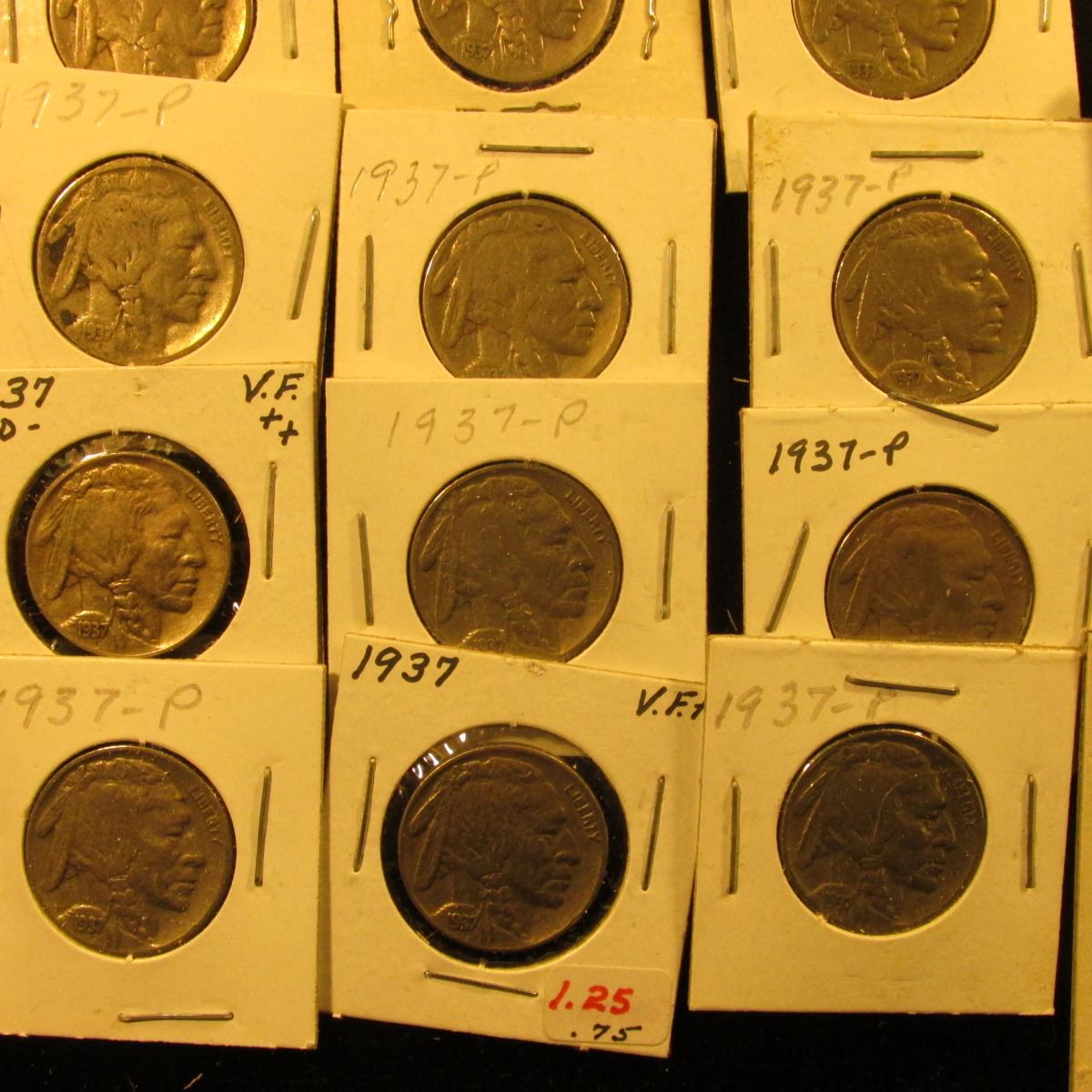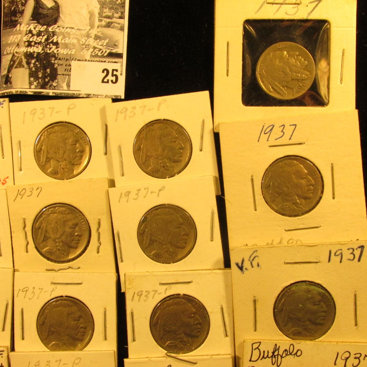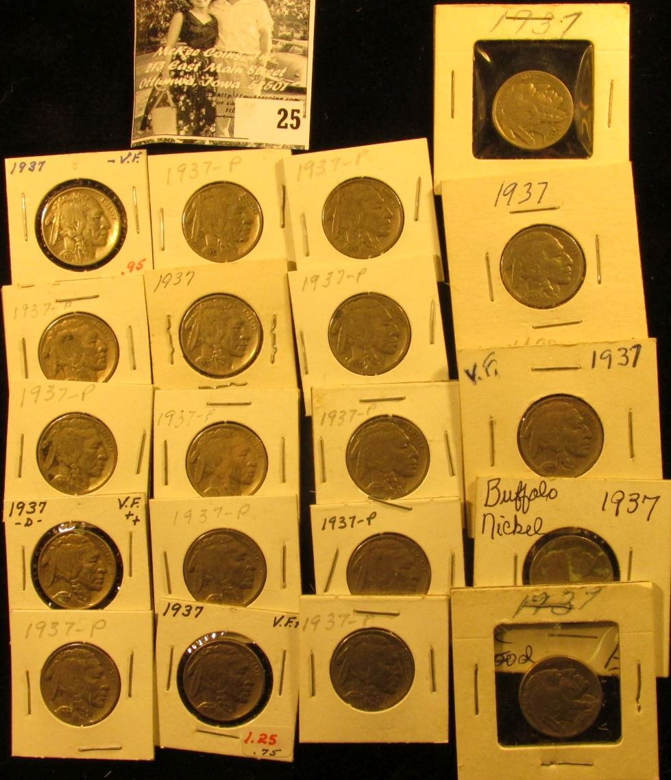 (20) 1937 P Buffalo Nickels all carded in 1 1/2" & 2" holders. Some slightly better grades.
