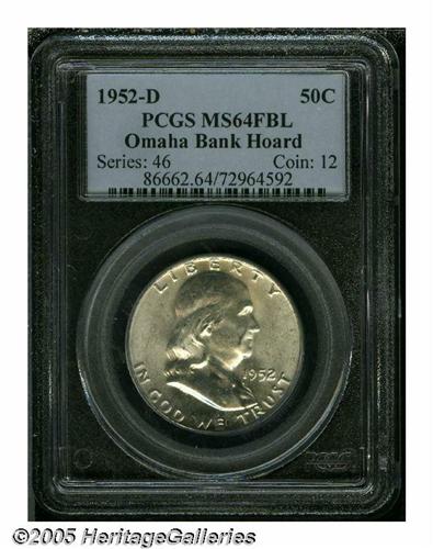 <B>(20) 1952-D<50C> MS64 Full Bell Lines PCGS.</B></I> Ex: Omaha Bank Hoard. An attractive assemblage of near-Gems, lustrous and generally well preserved. Several pieces display orange, olive-gray, or golden-brown toning, although the majority are lightly toned.