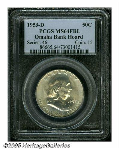 <B>(20) 1953-D<50C> MS64 Full Bell Lines PCGS.</B></I> Ex: Omaha Bank Hoard. A lustrous, clean, and relatively sharply struck certified roll of near-Gems. Dappled pale brown toning graces most examples, while a few have freckled russet or apricot and sky-blue colors.