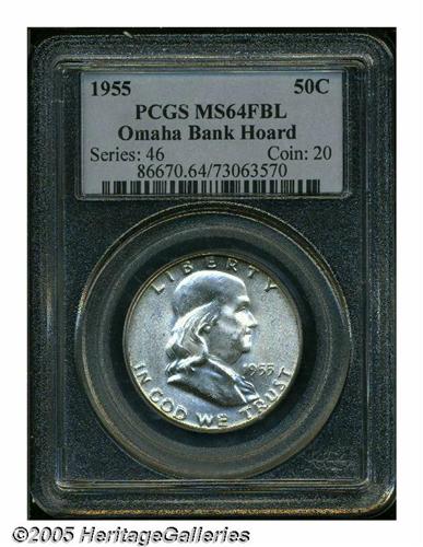 <B>(20) 1955<50C> MS64 Full Bell Lines PCGS.</B></I> Ex: Omaha Bank Hoard. An attractive and lustrous Choice original roll. The typical example is only delicately patinated, however, a couple of the pieces show dramatic multicolor toning on one side or the other. Only about 2.5 million 1955 business strike Halves were struck.