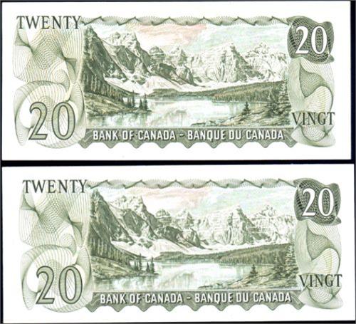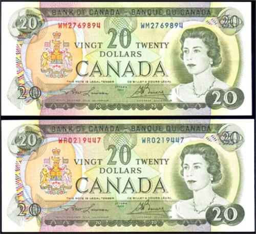 Bank of Canada Twenty Dollars 1969, Lawson-Bouey, BC-50b. Two notes, serial numbers WM2769894 and WR0219447. both AU-Uncirculated