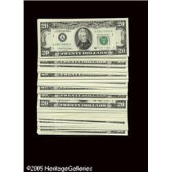 <B>$20 1990, 1993 Federal Reserve Notes. Choice Crisp Uncirculated or Better.</B></I><BR>Over $2300 face is contained in this lot that has only a couple of notes less than Choice and very little block duplication. Highlights include eighteen stars, a radar, a double quad, and three Twenties with only 2 - 4 digits.<BR> 107 notes Lot:16179