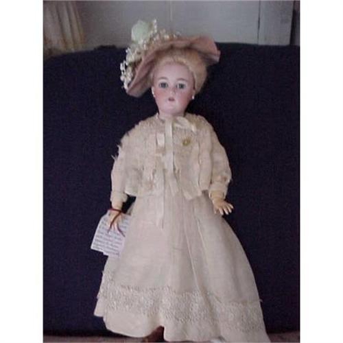 This is one of Simon Halbig's best models. She is a Gibson style doll with her mohair wig piled high and her silk walking suit. She has gorgeous bisque coloring with no damage or repairs. Her blue eyes sleep and she has pearl earrings. The compo body is in good condition with just normal wear. There is a hairline in the compo part way around one wrist but it is not broken. One ring finger looks to have been glued but it is a good job. This does not hurt her value as it is not easily noticed. The walking suit was sold to me on the doll and said to be original. Being raw silk it is very fragile and worn especially in the front and sleeves. The back is fine. The shoes look old but the socks look new. Her undies are lovely but I can't tell their age. I added the hat which is newer but appropriate. Personally I would remove the lace from the dress and use the dress to make a pattern for a replacement. Then attach the lace to the replacement dress. It is not a complicated style. I will not undress her for pictures. The body is fine. She is marked correctly on her head. She books for over 3000 + so again my price is a bargain.