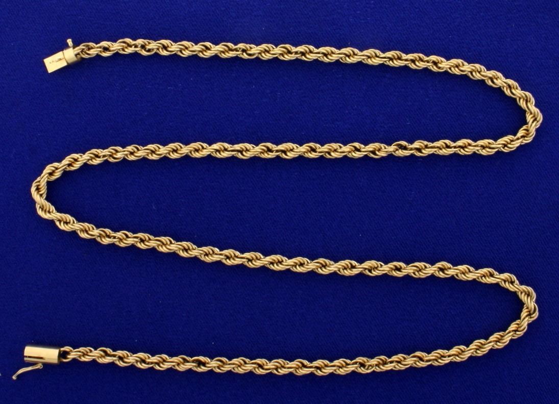 In 14k yellow gold. 4mm thick with safety clasp. 9.9g.
