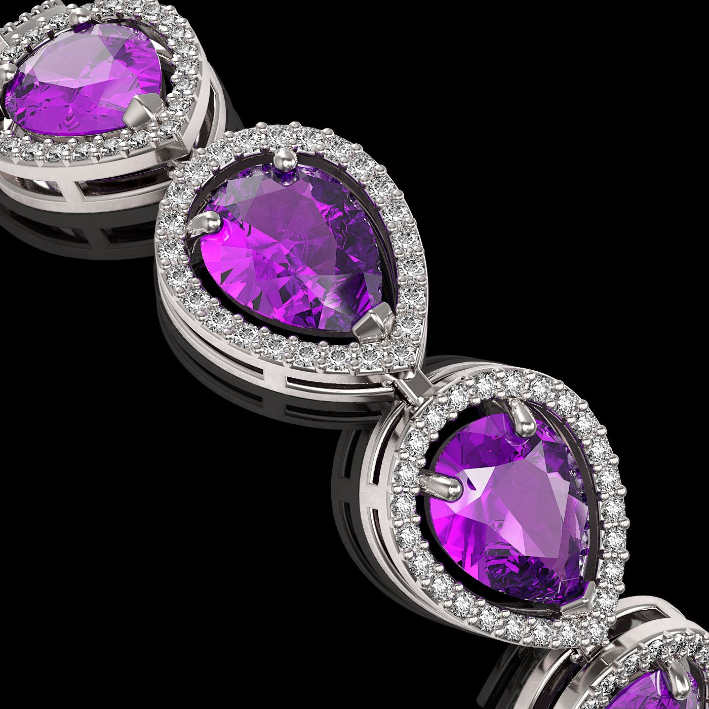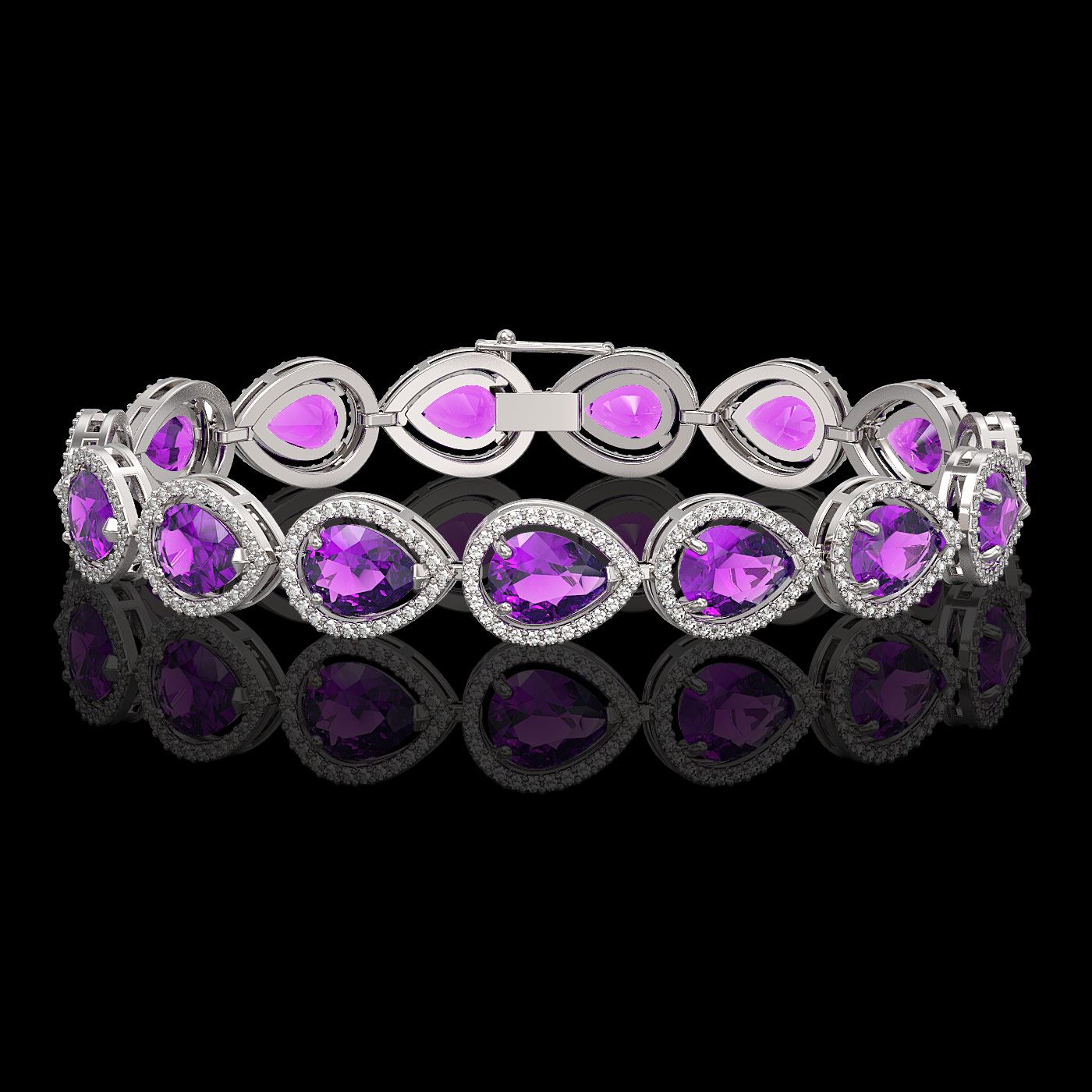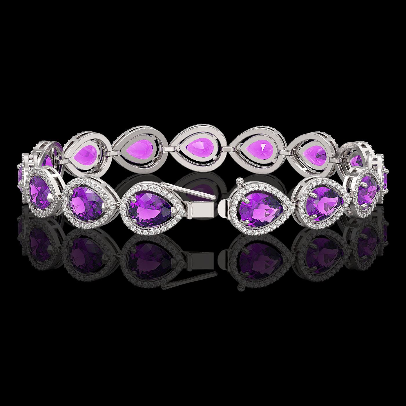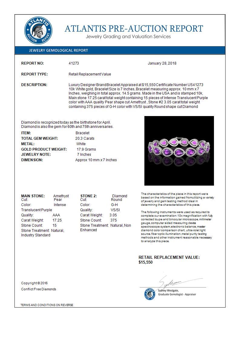 REF-282Y9K -41273 ---- 20.3 CTW Amethyst & Diamond Halo Bracelet 10K White Gold ---- Luxury Designer Brand Bracelet Appraised at $15,550 Certificate Number US41273 10k White gold, Bracelet Size is 7 Inches, Bracelet measuring approx. 10 mm x 7 Inches, weighing in total approx. 14.5 grams. Made in the USA and is stamped 10k, Main stone 17.25 carat total weight containing 15 pieces of Intense Translucent Purple color with AAA quality Pear shape cut Amethyst , Stone #2 3.05 carat total weight containing 375 pieces of G-H color with VS/SI quality Round shape cut Diamond