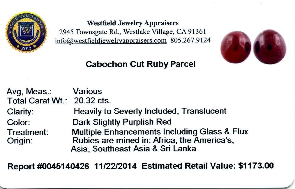 20.32ctw. Cabochon Cut Ruby Parcel. Westfield Appraised at $1,173.00.