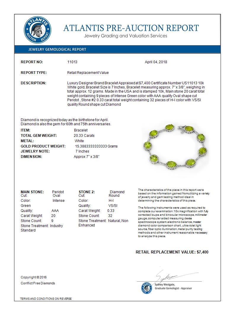 REF-103N3Y -11013 ---- 20.33 CTW Peridot & Diamond Bracelet 10K White Gold ---- Luxury Designer Brand Bracelet Appraised at $7,400 Certificate Number US11013 10k White gold, Bracelet Size is 7 Inches, Bracelet measuring approx. 7" x 3/8", weighing in total approx. 12 grams. Made in the USA and is stamped 10k, Main stone 20 carat total weight containing 9 pieces of Intense Green color with AAA quality Oval shape cut Peridot , Stone #2 0.33 carat total weight containing 32 pieces of H-I color with VS/SI quality Round shape cut Diamond