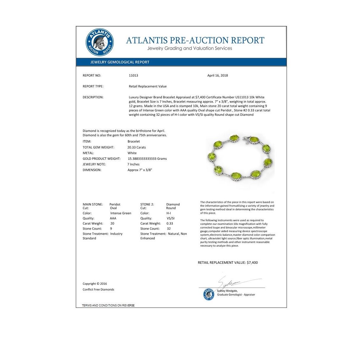 REF-103N3Y -11013 ---- 20.33 CTW Peridot & Diamond Bracelet 10K White Gold ---- Luxury Designer Brand Bracelet Appraised at $7,400 Certificate Number US11013 10k White gold, Bracelet Size is 7 Inches, Bracelet measuring approx. 7" x 3/8", weighing in total approx. 12 grams. Made in the USA and is stamped 10k, Main stone 20 carat total weight containing 9 pieces of Intense Green color with AAA quality Oval shape cut Peridot , Stone #2 0.33 carat total weight containing 32 pieces of H-I color with VS/SI quality Round shape cut Diamond