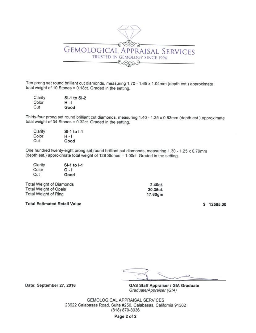 One electronically tested 14KT white gold lady's cast fashion ring with a scalloped basket halo with a bright polish finish. The featured lady's ring has a shank measuring 4.30 millimeters wide. Identified with markings of 'K14'. Condition is new, good workmanship. Containing: One crystal opal that is cut in a oval shaped cabochon and is prong set, measuring 24.20 mm long x 19.80 mm wide, and 11.47 mm thick and the approximate weight is 20.35 carats. The opal has a bright, multicolor play of color (fire) in a rolling flashfire pattern; a medium dome; a good cut; no inclusions; consistent in its brightness and pattern; and is not directional. Graded in the setting. Two prong set round brilliant cut diamonds, measuring 3.00 - 2.95 x 1.85mm (depth est.) approximate total weight of 2 Stones = 0.20ct. Graded in the setting. Clarity SI-1 to SI-2. Color: H - I Cut Good Ten prong set round brilliant cut diamonds, measuring 2.50 - 2.40 x 1.52mm (depth est.) approximate total weight of 10 Stones = 0.55ct. Graded in the setting. Clarity SI-1 to I-1. Color: H - I Cut Good Four prong set round brilliant cut diamonds, measuring 2.20 - 2.10 x 1.33mm (depth est.) approximate total weight of 4 Stones = 0.15ct. Graded in the setting. Clarity SI-1 to I-2. Color: H - I Cut Good Ten prong set round brilliant cut diamonds, measuring 1.70 - 1.65 x 1.04mm (depth est.) approximate total weight of 10 Stones = 0.18ct. Graded in the setting. Clarity SI-1 to SI-2. Color: H - I Cut Good Thirty-Four prong set round brilliant cut diamonds, measuring 1.40 - 1.35 x 0.83mm (depth est.) approximate total weight of 34 Stones = 0.32ct. Graded in the setting. Clarity SI-1 to I-1. Color: H - I Cut Good One Hundred Twenty-Eight prong set round brilliant cut diamonds, measuring 1.30 - 1.25 x 0.79mm (depth est.) approximate total weight of 128 Stones = 1.00ct. Graded in the setting. Clarity SI-1 to I-1. Color: G - I Cut Good. Total Weight of Diamonds 2.40ct.. Total Weight of Opals 20.35ct.. Total Weight of Ring 17.60gm. GAS Appraised at $12,585.00.