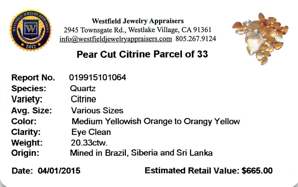 Thirty-three pear mixed cut natural citrine quartzs exact total weight 20.33ct., clarity is eye clean, type I, medium dark, brownish, yellowish orange color, (GIA yO 6/3), cut is good. Westfield Appraised at $665.00.