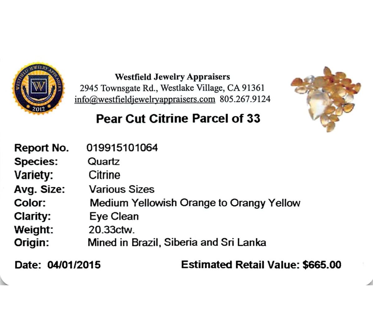 Thirty-three pear mixed cut natural citrine quartzs exact total weight 20.33ct., clarity is eye clean, type I, medium dark, brownish, yellowish orange color, (GIA yO 6/3), cut is good. Westfield Appraised at $665.00.