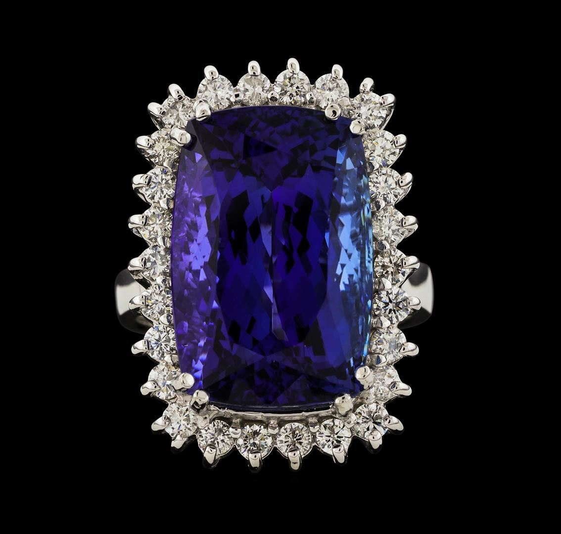 One electronically tested 14KT white gold lady's cast fashion ring with a basket halo with a bright polish finish. The featured lady's ring has a shank measuring 3.56 millimeters wide. Identified with markings of 'K14'. Condition is new, good workmanship. Containing: One prong set rectangular cushion modified brilliant cut natural tanzanite, measuring 18.38 x 12.22 x 10.36mm, (depth est.) 11%. bulge factor, approximate weight of 20.39ct., clarity is eye clean, medium dark, strong, violetish blue color, (GIA vB 6/5), cut is very good. Transmitting light with no distortion, transparent. Colored gemstones are presumed to have been subjected to commonly used enhancement processes. Graded in the setting. Twenty-Six prong set round brilliant cut diamonds, measuring 2.25 - 2.15 x 1.36mm (depth est.) approximate total weight of 26 Stones = 1.05ct. Graded in the setting. Clarity SI-1 to SI-2. Color: H - I Cut Good. Total Weight of Colored Stones 20.39ct.. Total Weight of Diamonds 1.05ct.. Total Weight of Ring 13.70gm. GAS Appraised at $29,720.00.