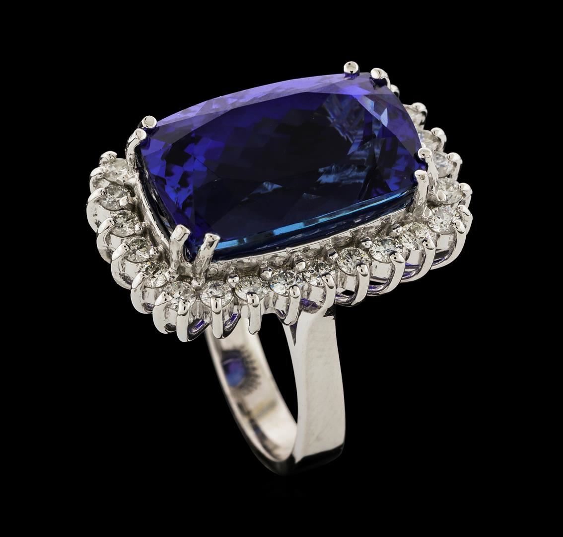One electronically tested 14KT white gold lady's cast fashion ring with a basket halo with a bright polish finish. The featured lady's ring has a shank measuring 3.56 millimeters wide. Identified with markings of 'K14'. Condition is new, good workmanship. Containing: One prong set rectangular cushion modified brilliant cut natural tanzanite, measuring 18.38 x 12.22 x 10.36mm, (depth est.) 11%. bulge factor, approximate weight of 20.39ct., clarity is eye clean, medium dark, strong, violetish blue color, (GIA vB 6/5), cut is very good. Transmitting light with no distortion, transparent. Colored gemstones are presumed to have been subjected to commonly used enhancement processes. Graded in the setting. Twenty-Six prong set round brilliant cut diamonds, measuring 2.25 - 2.15 x 1.36mm (depth est.) approximate total weight of 26 Stones = 1.05ct. Graded in the setting. Clarity SI-1 to SI-2. Color: H - I Cut Good. Total Weight of Colored Stones 20.39ct.. Total Weight of Diamonds 1.05ct.. Total Weight of Ring 13.70gm. GAS Appraised at $29,720.00.