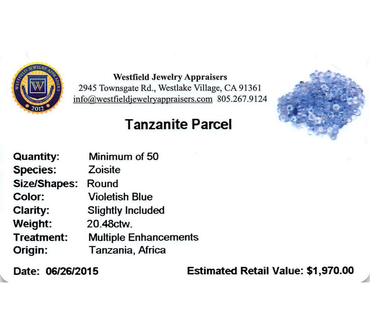 Fifty round mixed cut natural tanzanites, measuring 2.00 - 2.00 x 1.30 mm, exact total weight 20.48ct., clarity is slightly included, type I, medium light, very slightly grayish, violetish blue color, (GIA vB 4/3), cut is good. Measurements & the color grade are an average for the group, Color grade is an average for the group, Transmitting light with no distortion, transparent, Naturally occurring internal & external characteristics are present, Indications of multiple laboratory enhancements, including high temperature heat treatment. Westfield Appraised at $1,970.00.