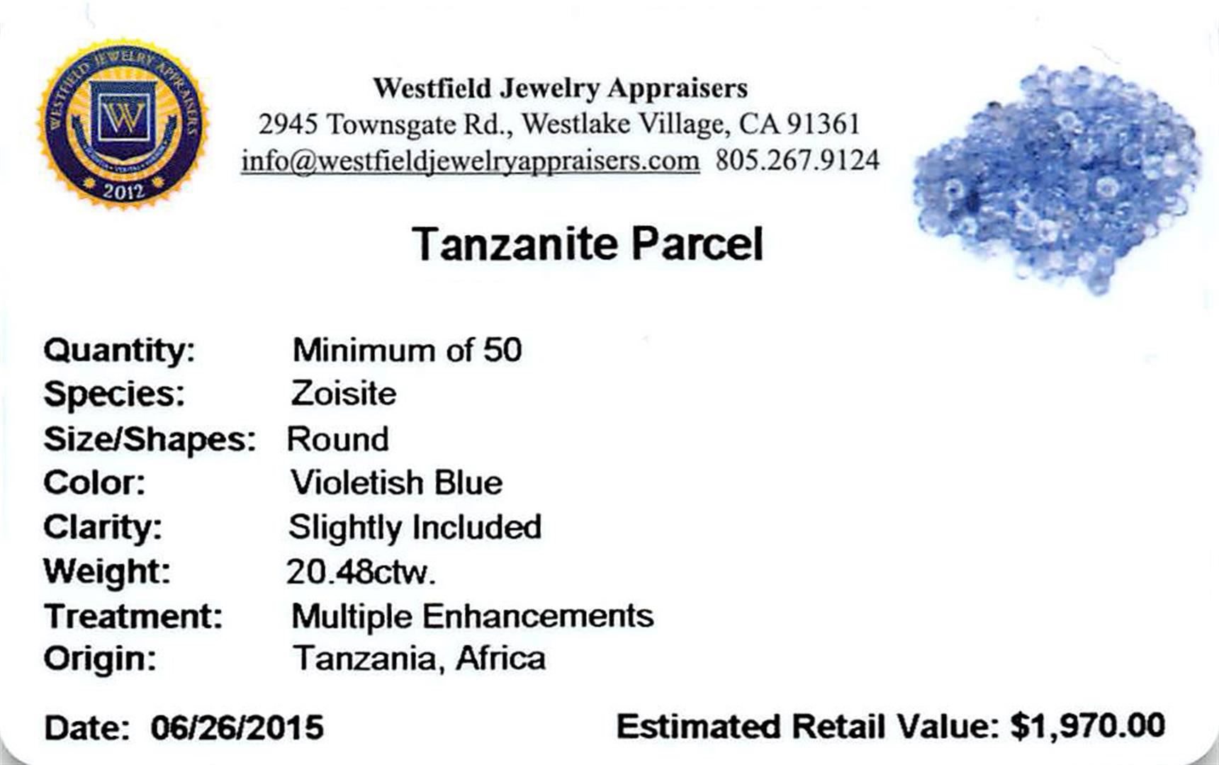 Fifty round mixed cut natural tanzanites, measuring 2.00 - 2.00 x 1.30 mm, exact total weight 20.48ct., clarity is slightly included, type I, medium light, very slightly grayish, violetish blue color, (GIA vB 4/3), cut is good. Measurements & the color grade are an average for the group, Color grade is an average for the group, Transmitting light with no distortion, transparent, Naturally occurring internal & external characteristics are present, Indications of multiple laboratory enhancements, including high temperature heat treatment. Westfield Appraised at $1,970.00.