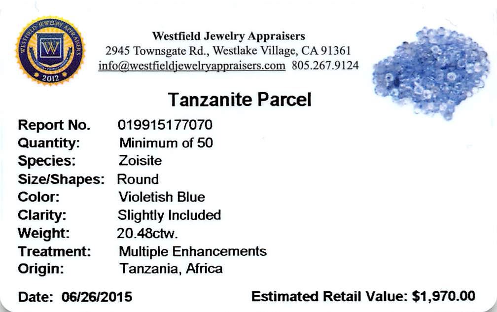 Fifty round mixed cut natural tanzanites, measuring 2.00 - 2.00 x 1.30 mm, exact total weight 20.48ct., clarity is slightly included, type I, medium light, very slightly grayish, violetish blue color, (GIA vB 4/3), cut is good. Measurements & the col Westfield Appraised at $1,970.00.