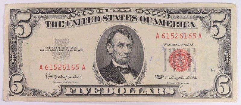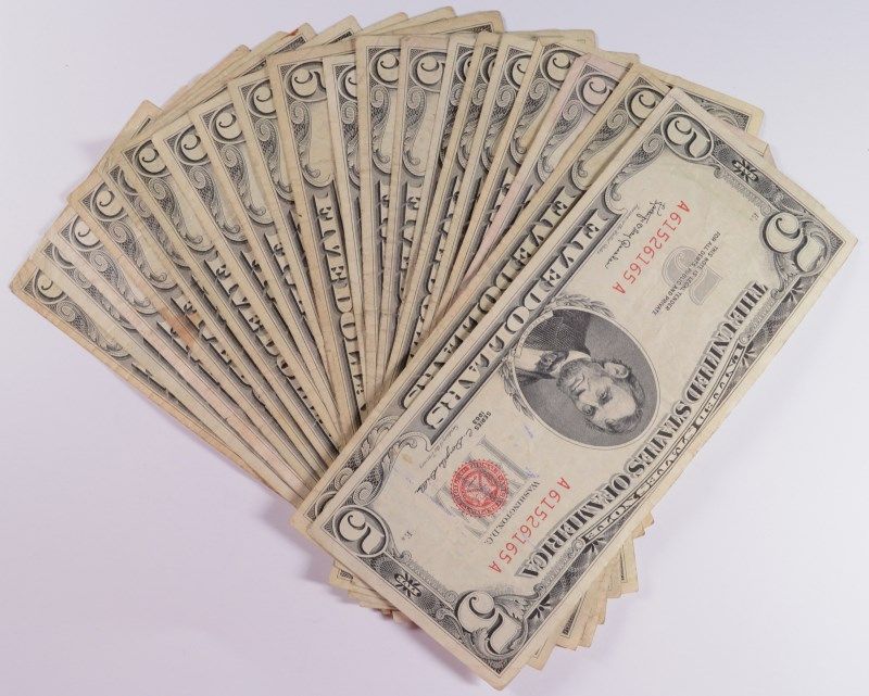 ( 20 ) $5.00 RED SEAL US NOTES, AVE CIRC TO VG
