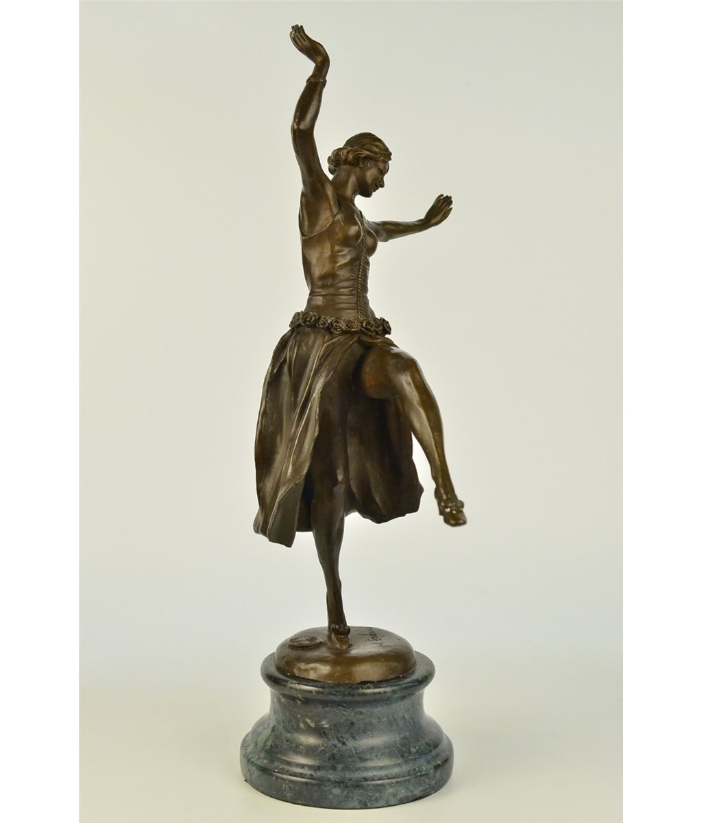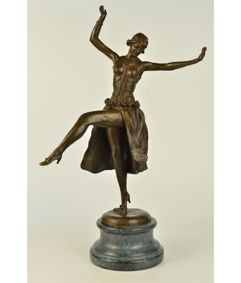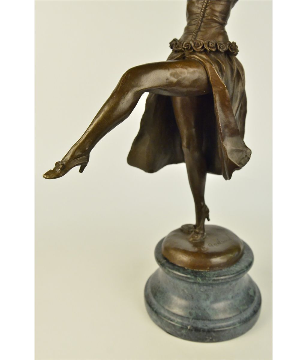 11XN214980 This Astonishing Piece Of Art Is A One Of A Kind. Her Arms Are Out Stretched To Her Side As She Stand On One Leg And Balances, She Is Careful Not To Make A Mistake During Her Performance. She Has Extremely Strong Legs And Arms Adding To Her Uniqueness. She Wears A Special Dress That Comes With A Flower Waist Belt And Opens Up Front Giving Her An Extremely Wide Slit, Which Exposes Her Legs Giving Her A Very Sexy Look. Her One Leg Is Out To The Side And Helps Break Up The Sculpture Giving It More Dimension. She Is An Exquisite Piece Of Art And Holds A True Art Deco Feel. This Sculpture Was Cast Using The "Lost Wax Method" And Has A Two Tone Brown Patina With Gold Highlights. She Is Mounted On An Art Deco Styled Black And Green Marble Base And Is 100% Bronze, Signed By A.Godard...................SHIPPING USA: $25....HI, ALASKA, CANADA: $69...ALL OTHER COUNTRIES: $169