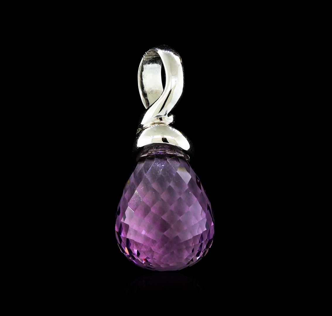 One electronically tested 14KT white gold lady's combination cast & assembled fashion pendant with a bright polish finish. The featured lady's pendant has a diamond set spiral bail and a total length of 30.5 millimeters. Identified with markings of '14K'. Condition is new, good workmanship. Containing: One inlay set briolette standard cut natural amethyst, measuring 19.00 x 13.00 x 13.00mm, (depth est.) 9%. bulge factor, approximate weight of 20.50ct., clarity is eye clean, light, moderately strong, purple color, (GIA P 3/4), cut is very good. Transmitting light with no distortion, transparent. Colored gemstones are presumed to have been subjected to commonly used enhancement processes. Graded in the setting. Six channel set round brilliant cut diamonds, measuring 1.60 - 1.55 x 0.98mm (depth est.) approximate total weight of 6 Stones = 0.09ct. Graded in the setting. Clarity SI-1 to SI-2. Color: G - H Cut Good. Total Weight of Colored Stones 20.50ct.. Total Weight of Diamonds 0.09ct.. Total Weight of Pendant 6.50gm GAS Appraised at $1,920.00.