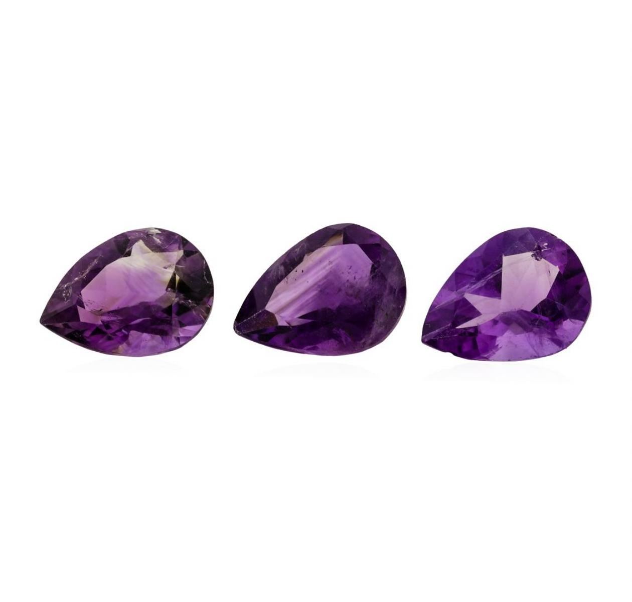 One natural pear cut amethyst parcel of three with an exact weight of 20.50 ctw., clarity is moderately included, purple to v.s. brownish purple, medium to medium light. Gemological Appraisals Services estimates the retail value at $615 GAS Appraised.