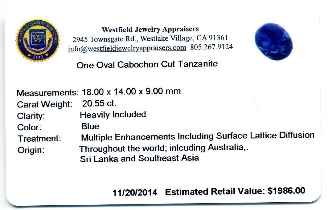 20.55ctw. One Oval Cabochon Cut Tanzanite . Westfield Appraised at $1,986.00.