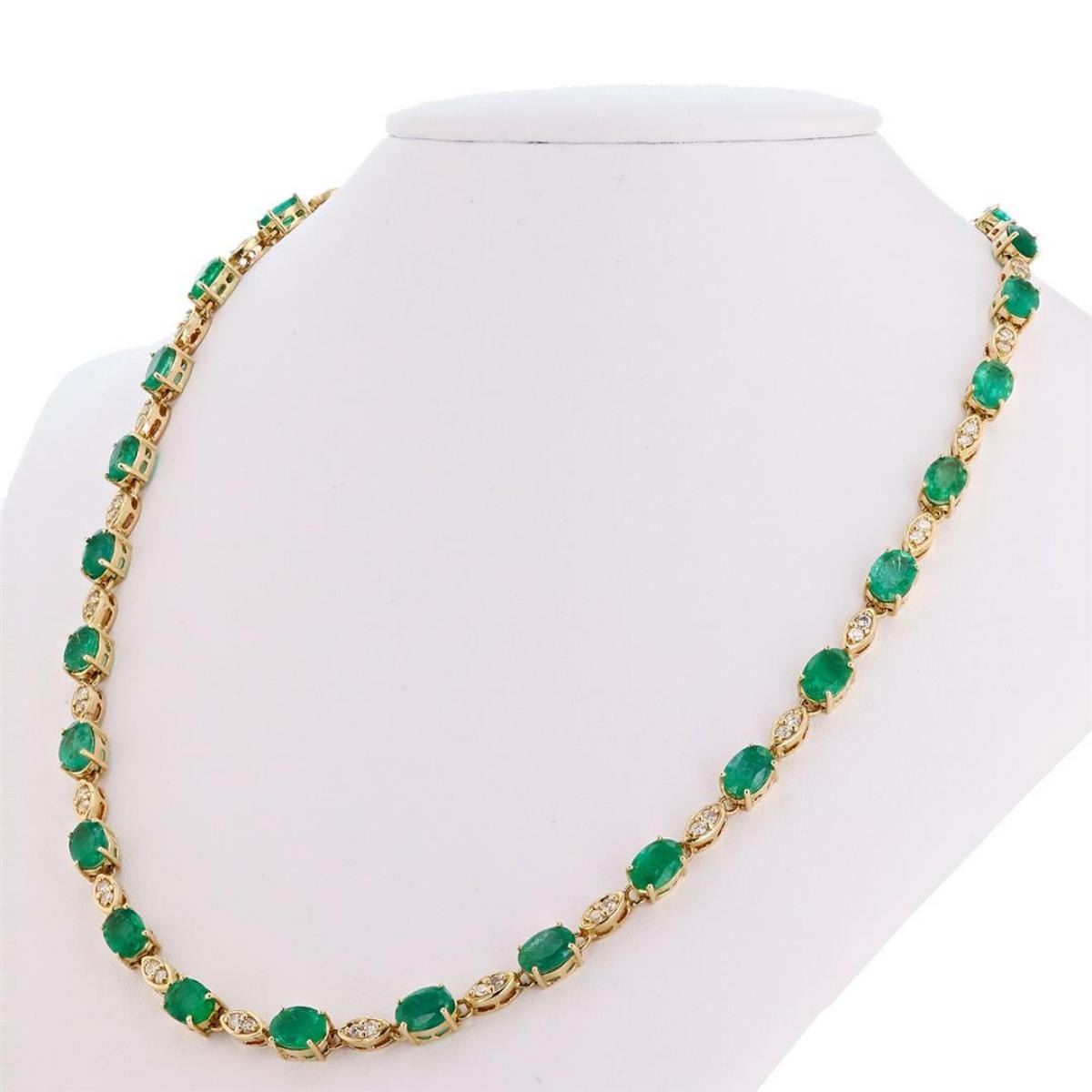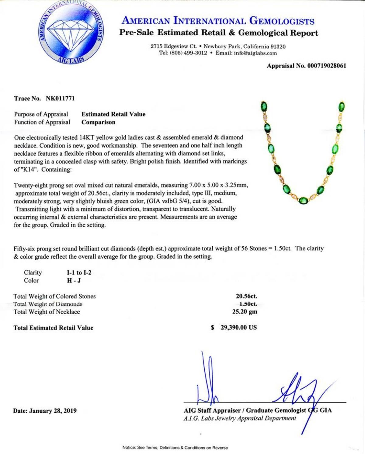 One electronically tested 14KT yellow gold ladies cast and assembled emerald and diamond necklace. Condition is new, good workmanship. The seventeen and one half inch length necklace features a flexible ribbon of emeralds alternating with diamond set links, terminating in a concealed clasp with safety. Bright polish finish. Identified with markings of "K14". Containing: Twenty-eight prong set oval mixed cut natural emeralds, measuring 7.00 x 5.00 x 3.25mm, approximate total weight of 20.56ct., clarity is moderately included, type III, medium, moderately strong, very slightly bluish green color, (GIA vslbG 5/4), cut is good. Transmitting light with a minimum of distortion, transparent to translucent. Naturally occurring internal and external characteristics are present. Measurements are an average for the group. Graded in the setting. Fifty-six prong set round brilliant cut diamonds (depth est.) approximate total weight of 56 Stones = 1.50ct. The clarity and color grade reflect the overall average for the group. Graded in the setting. Clarity I-1 to I-2 Color H-J Total Weight of Colored Stones 20.56ct. Total Weight of Diamonds 1.50ct. Total Weight of Necklace 25.20 gm