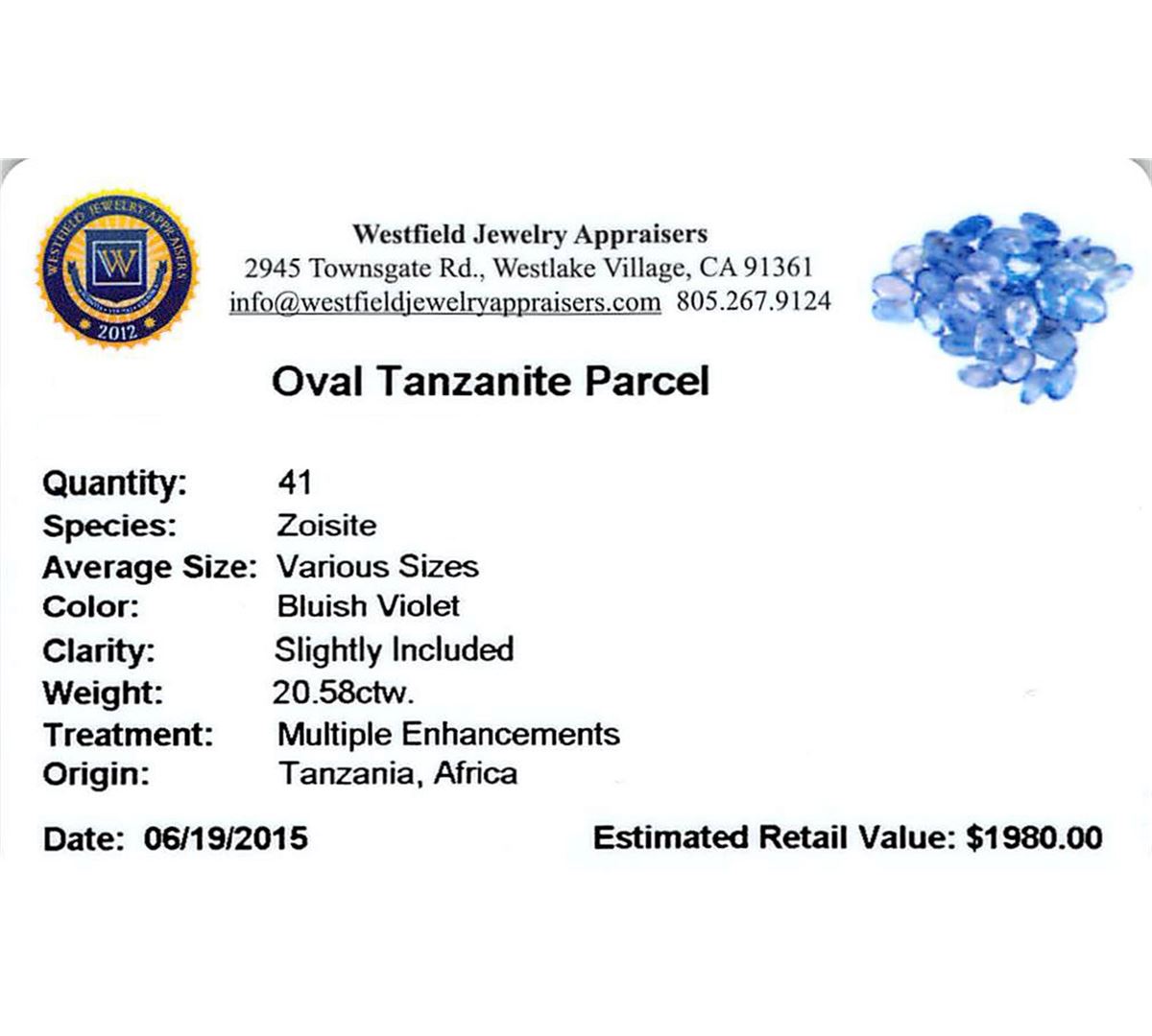 Forty-one oval mixed cut natural tanzanites exact total weight 20.58ct., clarity is slightly included, type I, medium dark, very slightly grayish, bluish violet color, (GIA bV 6/3), cut is good. Transmitting light with a minimum of distortion, transparent. Naturally occurring internal & external characteristics are present. Color grade is an average for the group. Tanzanite is a very rare gemstone that is only found in the country of Tanzania. Originally discovered in 1967. Tiffany & Company, named the stone Tanzanite. It is found in the Usumburu Mountains that border the Umba Valley of northern Tanzania. Tanzanite occurs in gray, brown, violet, blue, reddish-purple, & green. The gem is interesting because of its exceptional pleochroism. Rotated in different directions a tanzanite will exhibit multiple changes of color. Tanzanite has a low tolerance to ultrasonic cleaning, and should not be cleaned using this method. Westfield Appraised at $1,980.00.