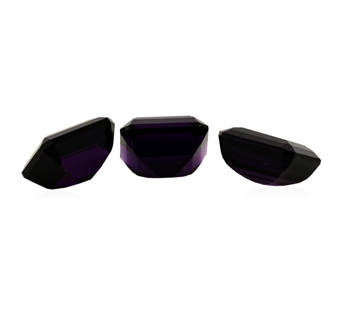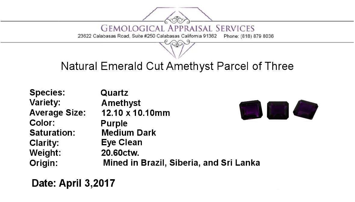 One natural emerald cut amethyst parcel of three with an exact weight of 20.60ctw., clarity is eye clean, purple, medium dark. Gemological Appraisals Services estimates the retail value at $700.4 GAS Appraised.