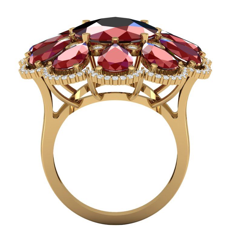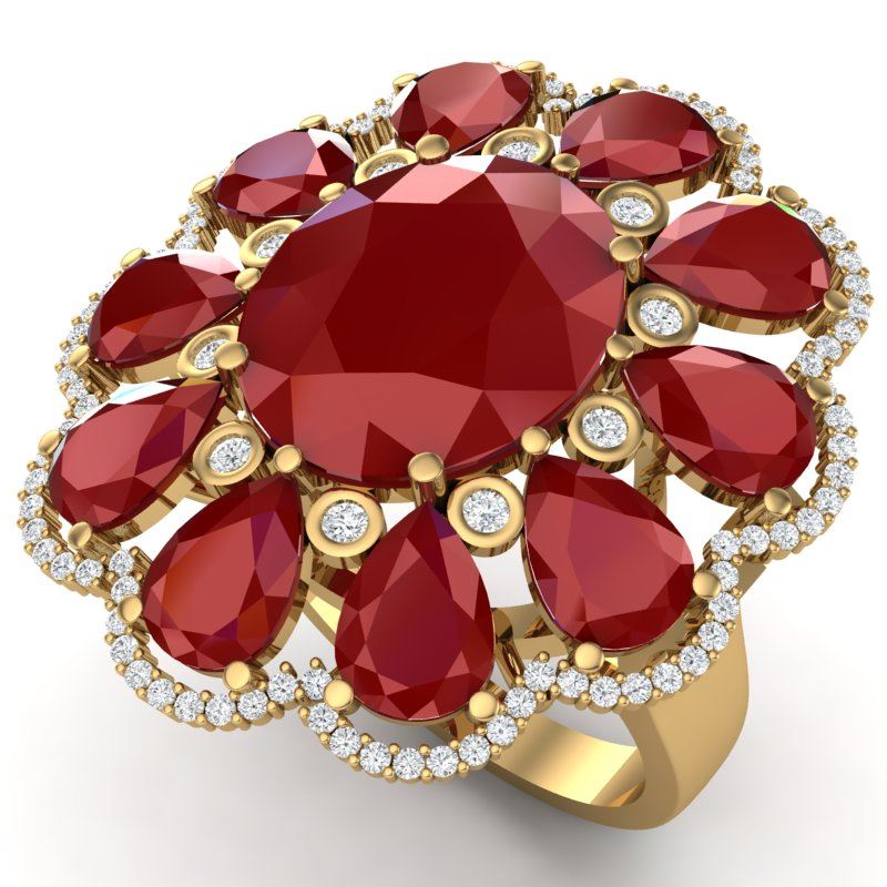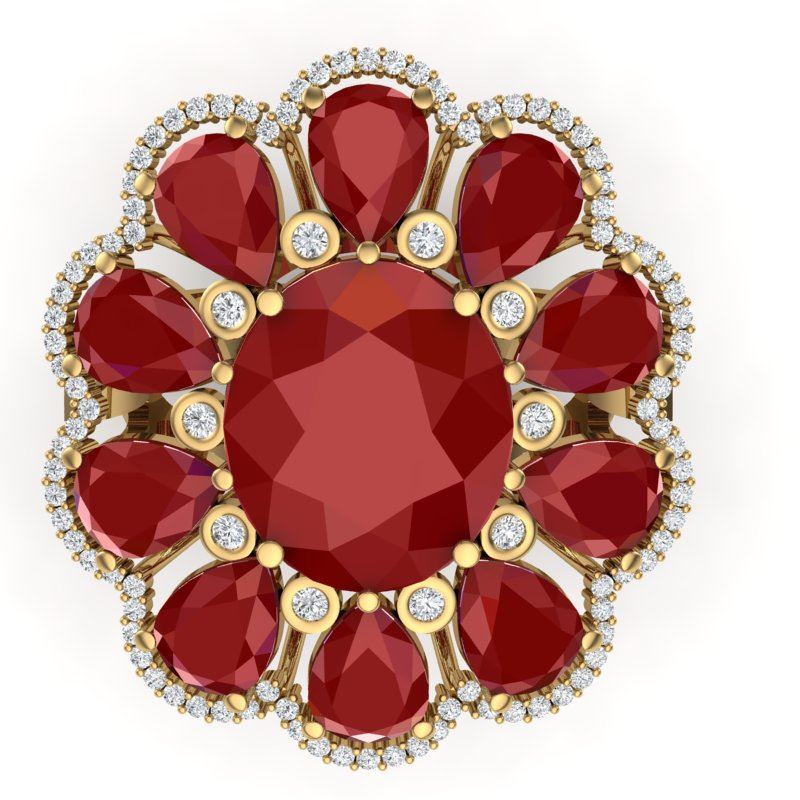 20.63 CTW Royalty Designer Ruby & VS Diamond Ring 18K Yellow Gold ---- Luxury Designer Brand Ring Appraised Retail Price at $27,000 ---- SKU Number US39143 18K Yellow gold Ring Size is 7, Ring measuring approx. 1 1/4 x 1 1/8 Inches, weighing in total approx. 21 grams. Made in the USA and is stamped 18K, Main stone 8.75 carat total weight containing 1 pieces of Intense Mid-Opaque Red color with AAA quality Oval shape cut Ruby , Stone #2 10.88 carat total weight containing 10 pieces of Intense Mid-Opaque Red color with AAA quality Pear shape cut