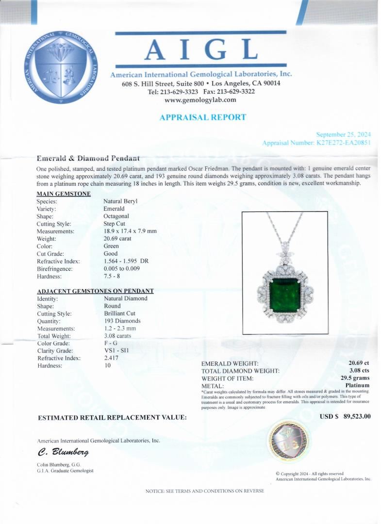 One polished, stamped, and tested platinum pendant marked Oscar Friedman. The pendant is mounted with: 1 genuine emerald center stone weighing approximately 20.69 carat, and 193 genuine round diamonds weighing approximately 3.08 carats. The pendant hangs from a platinum rope chain measuring 18 inches in length. This item weighs 29.5 grams, condition is new, excellent workmanship. #MAIN GEMSTONE# Species: Natural Beryl; Variety: Emerald; Shape: Octagonal; Cutting Style: Step Cut; Measurements: 18.9 x 17.4 x 7.9mm; Weight: 20.69 carat; Color: Green; Cut Grade: Good; Refractive Index: 1.564 - 1.595 DR; Birefringence: 0.005 to 0.009; Hardness: 7.5 - 8 #ADJACENT GEMSTONES ON PENDANT# Identity: Natural Diamond; Shape: Round; Cutting Style: Brilliant Cut; Quantity: 193 Diamonds; Measurements: 1.2 - 2.3mm; Total Weight: 3.08 carats; Color Grade: F-G; Clarity Grade: VS1-SI1; Refractive Index: 2.417; Hardness: 10 #EMERALD WEIGHT: 20.69 ct; TOTAL DIAMOND WEIGHT: 3.08 cts; WEIGHT OF ITEM: 29.5 grams; METAL: Platinum #Size: 18