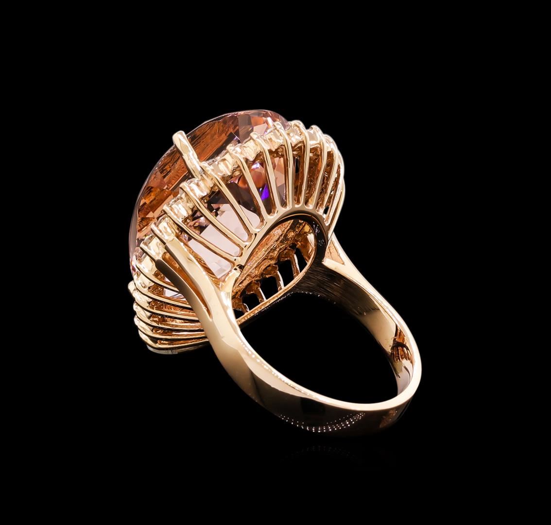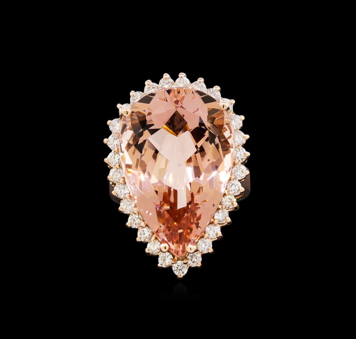 One electronically tested 14KT rose gold lady's cast fashion ring with a basket halo with a bright polish finish. The featured lady's ring has a shank measuring 3.76 millimeters wide. Identified with markings of "K14". Condition is new, good workmanship. Containing: One prong set pear modified brilliant cut natural morganite, measuring 23.30 x 15.70 x 10.50mm, approximate weight of 20.71ct., clarity is eye clean, type I, light, very slightly brownish, orangy red color, (GIA oR 3/3), cut is very good. Transmitting light with no distortion, transparent. Colored gemstones are presumed to have been subjected to commonly used enhancement processes. Graded in the setting. Twenty-Nine prong set round brilliant cut diamonds, measuring 2.10 - 2.00 x 1.27mm (depth est.) approximate total weight of 29 Stones = 0.95ct. Graded in the setting. Clarity: SI-1 to I-1. Color: H - I. Cut Good. Total Weight of Colored Stones 20.71ct. Total Weight of Diamonds 0.95ct. Total Weight of Ring 12.60gm. GAS Appraised at $14,885.00.