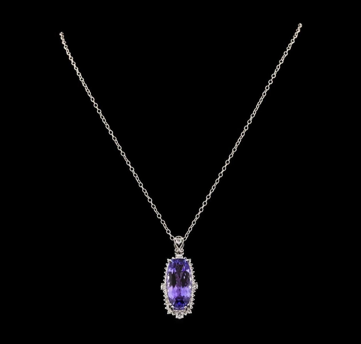 One electronically tested 14KT white gold lady's combination cast & assembled fashion pendant & chain 18.0' long, 1.9mm twisted oval shape link with a lobster claw clasp with a basket halo with a bright polish with milgrain detailing finish. The featured lady's pendant has a drop of 39 millimeters. Identified with markings of 'K14'. Condition is new, good workmanship. Containing: One prong set rectangular cushion modified brilliant cut natural tanzanite, measuring 23.05 x 11.47 x 8.80mm, (depth est.) 13%. bulge factor, approximate weight of 20.72ct., clarity is eye clean, medium light, moderately strong, bluish violet color, (GIA bV 4/4), cut is very good. Transmitting light with no distortion, transparent. Colored gemstones are presumed to have been subjected to commonly used enhancement processes. Graded in the setting. Four prong set round brilliant cut diamonds, measuring 3.10 - 3.00 x 1.86mm (depth est.) approximate total weight of 4 Stones = 0.42ct. Graded in the setting. Clarity SI-1 to SI-2. Color: G - H Cut Good One prong set round brilliant cut diamond, measuring 2.50 - 2.45 x 1.54mm (depth est.) approximate weight of 0.06ct. Graded in the setting. Clarity SI-2. Color: G Cut Good Twenty-Eight prong set round brilliant cut diamonds, measuring 1.80 - 1.70 x 1.09mm (depth est.) approximate total weight of 28 Stones = 0.57ct. Graded in the setting. Clarity VS-2 to SI-2. Color: G - H Cut Good. Total Weight of Colored Stones 20.72ct.. Total Weight of Diamonds 1.05ct.. Total Weight of Pendant & Chain 13.20gm GAS Appraised.