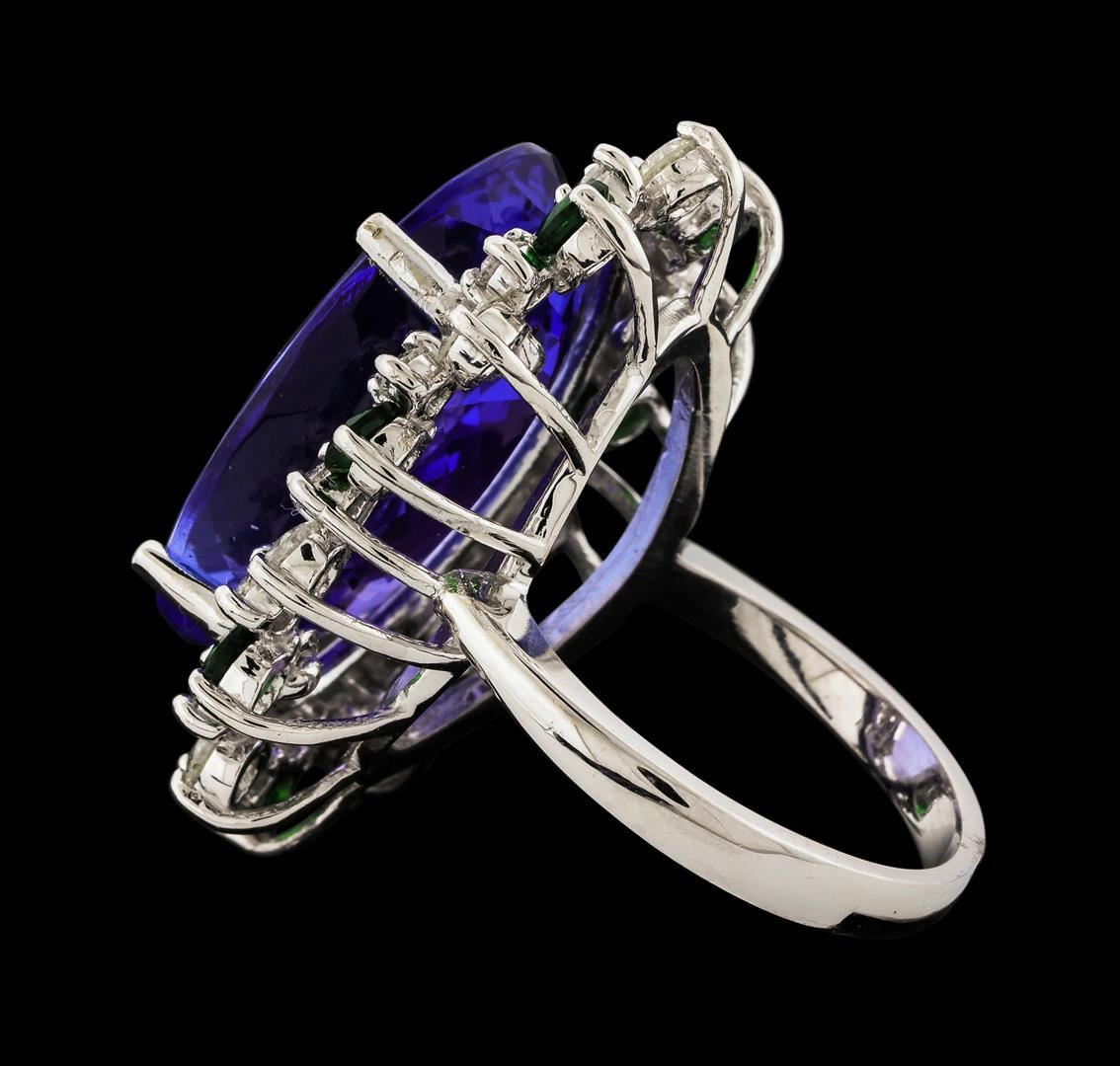 One electronically tested 14KT white gold lady's cast fashion ring with a staggered basket halo with a bright polish finish. The featured lady's ring has a shank measuring 2.59 millimeters wide. Identified with markings of 'K14'. Condition is new, good workmanship. Containing: One prong set oval modified brilliant cut natural tanzanite, measuring 21.44 x 14.90 x 7.75mm, (depth est.) 13%. bulge factor, approximate weight of 19.76ct., clarity is eye clean, medium light, moderately strong, violetish blue color, (GIA vB 4/4), cut is good. Transmitting light with no distortion, transparent. Colored gemstones are presumed to have been subjected to commonly used enhancement processes. Graded in the setting. Seven prong set round modified brilliant cut natural tsavorite garnets, measuring 3.20 - 3.10 x 2.05 mm, (depth est.) approximate total weight of 1.02ct., clarity is eye clean, medium dark, strong, slightly yellowish green color, (GIA slyG 6/5), cut is good. Transmitting light with no distortion, transparent. Colored gemstones are presumed to have been subjected to commonly used enhancement processes. Graded in the setting. Seven prong set round brilliant cut diamonds, measuring 3.10 - 3.00 x 1.83mm (depth est.) approximate total weight of 7 Stones = 0.73ct. Graded in the setting. Clarity SI-1 to SI-2. Color: G - H Cut Good Fourteen prong set round brilliant cut diamonds, measuring 2.20 - 2.10 x 1.29mm (depth est.) approximate total weight of 14 Stones = 0.51ct. Graded in the setting. Clarity SI-1 to SI-2. Color: G - I Cut Good. Total Weight of Colored Stones 20.78ct.. Total Weight of Diamonds 1.24ct.. Total Weight of Ring 12.10gm GAS Appraised at $26,300.00.