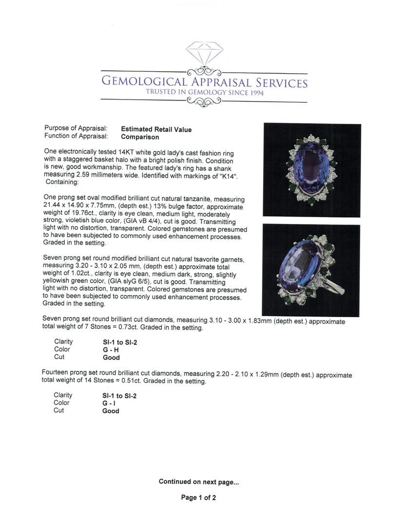 One electronically tested 14KT white gold lady's cast fashion ring with a staggered basket halo with a bright polish finish. The featured lady's ring has a shank measuring 2.59 millimeters wide. Identified with markings of 'K14'. Condition is new, good workmanship. Containing: One prong set oval modified brilliant cut natural tanzanite, measuring 21.44 x 14.90 x 7.75mm, (depth est.) 13%. bulge factor, approximate weight of 19.76ct., clarity is eye clean, medium light, moderately strong, violetish blue color, (GIA vB 4/4), cut is good. Transmitting light with no distortion, transparent. Colored gemstones are presumed to have been subjected to commonly used enhancement processes. Graded in the setting. Seven prong set round modified brilliant cut natural tsavorite garnets, measuring 3.20 - 3.10 x 2.05 mm, (depth est.) approximate total weight of 1.02ct., clarity is eye clean, medium dark, strong, slightly yellowish green color, (GIA slyG 6/5), cut is good. Transmitting light with no distortion, transparent. Colored gemstones are presumed to have been subjected to commonly used enhancement processes. Graded in the setting. Seven prong set round brilliant cut diamonds, measuring 3.10 - 3.00 x 1.83mm (depth est.) approximate total weight of 7 Stones = 0.73ct. Graded in the setting. Clarity SI-1 to SI-2. Color: G - H Cut Good Fourteen prong set round brilliant cut diamonds, measuring 2.20 - 2.10 x 1.29mm (depth est.) approximate total weight of 14 Stones = 0.51ct. Graded in the setting. Clarity SI-1 to SI-2. Color: G - I Cut Good. Total Weight of Colored Stones 20.78ct.. Total Weight of Diamonds 1.24ct.. Total Weight of Ring 12.10gm GAS Appraised at $26,300.00.