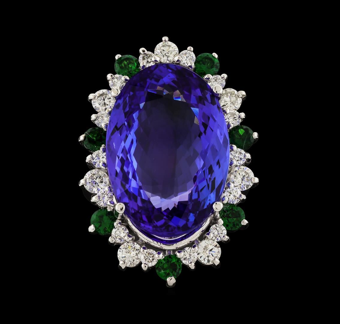 One electronically tested 14KT white gold lady's cast fashion ring with a staggered basket halo with a bright polish finish. The featured lady's ring has a shank measuring 2.59 millimeters wide. Identified with markings of 'K14'. Condition is new, good workmanship. Containing: One prong set oval modified brilliant cut natural tanzanite, measuring 21.44 x 14.90 x 7.75mm, (depth est.) 13%. bulge factor, approximate weight of 19.76ct., clarity is eye clean, medium light, moderately strong, violetish blue color, (GIA vB 4/4), cut is good. Transmitting light with no distortion, transparent. Colored gemstones are presumed to have been subjected to commonly used enhancement processes. Graded in the setting. Seven prong set round modified brilliant cut natural tsavorite garnets, measuring 3.20 - 3.10 x 2.05 mm, (depth est.) approximate total weight of 1.02ct., clarity is eye clean, medium dark, strong, slightly yellowish green color, (GIA slyG 6/5), cut is good. Transmitting light with no distortion, transparent. Colored gemstones are presumed to have been subjected to commonly used enhancement processes. Graded in the setting. Seven prong set round brilliant cut diamonds, measuring 3.10 - 3.00 x 1.83mm (depth est.) approximate total weight of 7 Stones = 0.73ct. Graded in the setting. Clarity SI-1 to SI-2. Color: G - H Cut Good Fourteen prong set round brilliant cut diamonds, measuring 2.20 - 2.10 x 1.29mm (depth est.) approximate total weight of 14 Stones = 0.51ct. Graded in the setting. Clarity SI-1 to SI-2. Color: G - I Cut Good. Total Weight of Colored Stones 20.78ct.. Total Weight of Diamonds 1.24ct.. Total Weight of Ring 12.10gm GAS Appraised at $26,300.00.