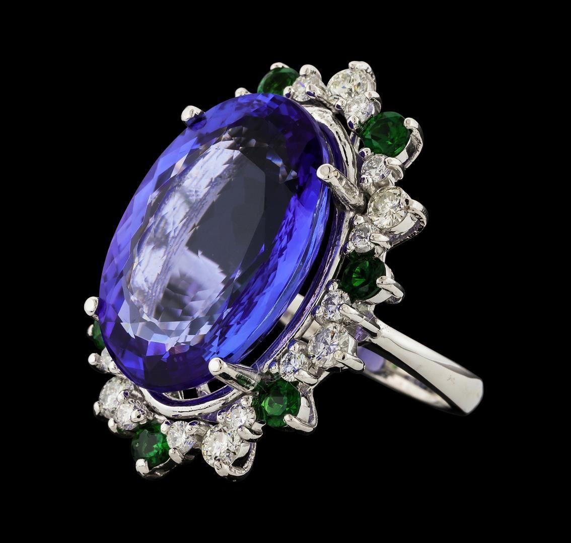 One electronically tested 14KT white gold lady's cast fashion ring with a staggered basket halo with a bright polish finish. The featured lady's ring has a shank measuring 2.59 millimeters wide. Identified with markings of 'K14'. Condition is new, good workmanship. Containing: One prong set oval modified brilliant cut natural tanzanite, measuring 21.44 x 14.90 x 7.75mm, (depth est.) 13%. bulge factor, approximate weight of 19.76ct., clarity is eye clean, medium light, moderately strong, violetish blue color, (GIA vB 4/4), cut is good. Transmitting light with no distortion, transparent. Colored gemstones are presumed to have been subjected to commonly used enhancement processes. Graded in the setting. Seven prong set round modified brilliant cut natural tsavorite garnets, measuring 3.20 - 3.10 x 2.05 mm, (depth est.) approximate total weight of 1.02ct., clarity is eye clean, medium dark, strong, slightly yellowish green color, (GIA slyG 6/5), cut is good. Transmitting light with no distortion, transparent. Colored gemstones are presumed to have been subjected to commonly used enhancement processes. Graded in the setting. Seven prong set round brilliant cut diamonds, measuring 3.10 - 3.00 x 1.83mm (depth est.) approximate total weight of 7 Stones = 0.73ct. Graded in the setting. Clarity SI-1 to SI-2. Color: G - H Cut Good Fourteen prong set round brilliant cut diamonds, measuring 2.20 - 2.10 x 1.29mm (depth est.) approximate total weight of 14 Stones = 0.51ct. Graded in the setting. Clarity SI-1 to SI-2. Color: G - I Cut Good. Total Weight of Colored Stones 20.78ct.. Total Weight of Diamonds 1.24ct.. Total Weight of Ring 12.10gm GAS Appraised.