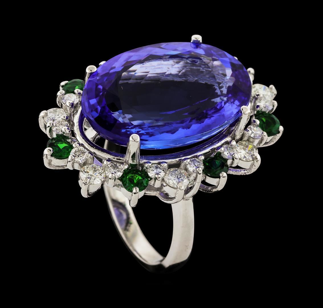 One electronically tested 14KT white gold lady's cast fashion ring with a staggered basket halo with a bright polish finish. The featured lady's ring has a shank measuring 2.59 millimeters wide. Identified with markings of 'K14'. Condition is new, good workmanship. Containing: One prong set oval modified brilliant cut natural tanzanite, measuring 21.44 x 14.90 x 7.75mm, (depth est.) 13%. bulge factor, approximate weight of 19.76ct., clarity is eye clean, medium light, moderately strong, violetish blue color, (GIA vB 4/4), cut is good. Transmitting light with no distortion, transparent. Colored gemstones are presumed to have been subjected to commonly used enhancement processes. Graded in the setting. Seven prong set round modified brilliant cut natural tsavorite garnets, measuring 3.20 - 3.10 x 2.05 mm, (depth est.) approximate total weight of 1.02ct., clarity is eye clean, medium dark, strong, slightly yellowish green color, (GIA slyG 6/5), cut is good. Transmitting light with no distortion, transparent. Colored gemstones are presumed to have been subjected to commonly used enhancement processes. Graded in the setting. Seven prong set round brilliant cut diamonds, measuring 3.10 - 3.00 x 1.83mm (depth est.) approximate total weight of 7 Stones = 0.73ct. Graded in the setting. Clarity SI-1 to SI-2. Color: G - H Cut Good Fourteen prong set round brilliant cut diamonds, measuring 2.20 - 2.10 x 1.29mm (depth est.) approximate total weight of 14 Stones = 0.51ct. Graded in the setting. Clarity SI-1 to SI-2. Color: G - I Cut Good. Total Weight of Colored Stones 20.78ct.. Total Weight of Diamonds 1.24ct.. Total Weight of Ring 12.10gm GAS Appraised.