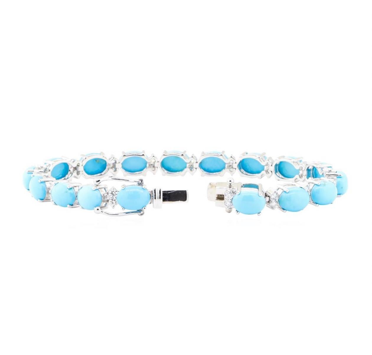 One electronically tested 14KT white gold lady's combination cast & assembled fashion bracelet with a tongue clasp with foldover safety with a bright polish finish. The featured lady's bracelet measures approximately seven inches in length. Identified with markings of '14K'. Condition is new, good workmanship. Containing: Seventeen prong set oval cabochon standard cut natural turquoises, measuring 8.15 x 6.17 x 3.05mm, (depth est.) approximate total weight of 19.55ct., medium, strong, very slightly greenish blue color, (GIA vslgB 5/5), cut is excellent. The featured stones are untreated Arizona turquoise. Graded in the setting. Thirty-Four prong set round brilliant cut diamonds, measuring 2.20 - 2.10 x 1.29mm (depth est.) approximate total weight of 34 Stones = 1.25ct. Graded in the setting. Color G - I Clarity VS-1 to VS-2 Cut Very Good. Total Weight of Colored Stones 19.55ct.. Total Weight of Diamonds 1.25ct.. Total Weight of Bracelet 16.20gm GAS Appraised at $12075.00. GAS Appraised.