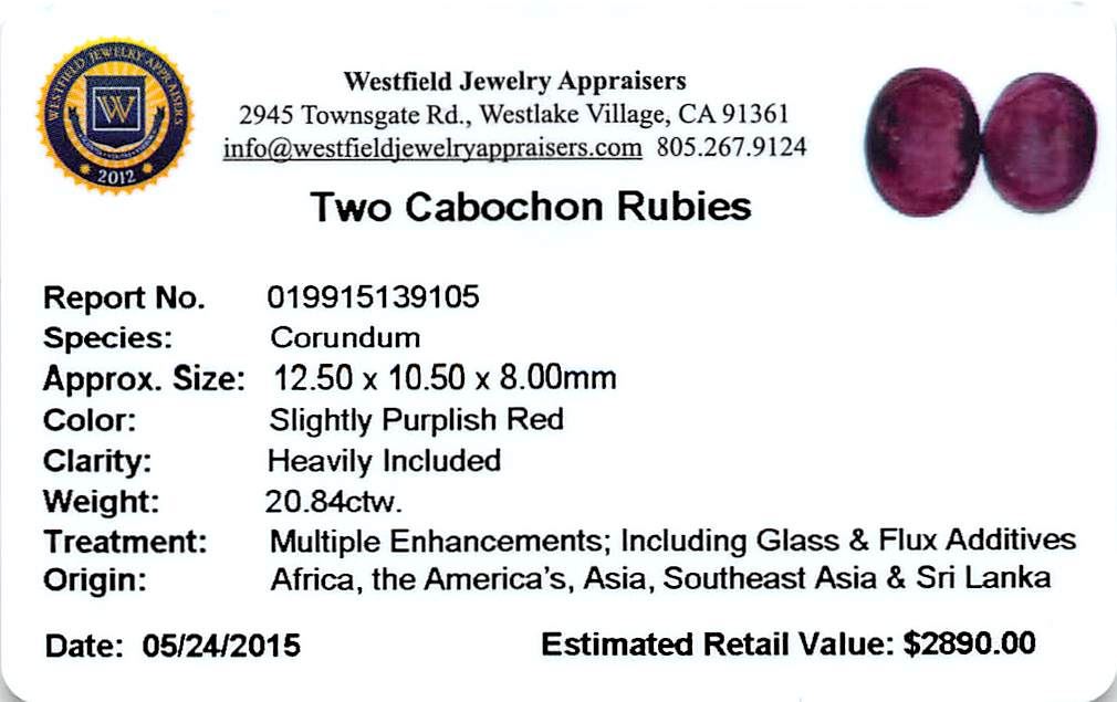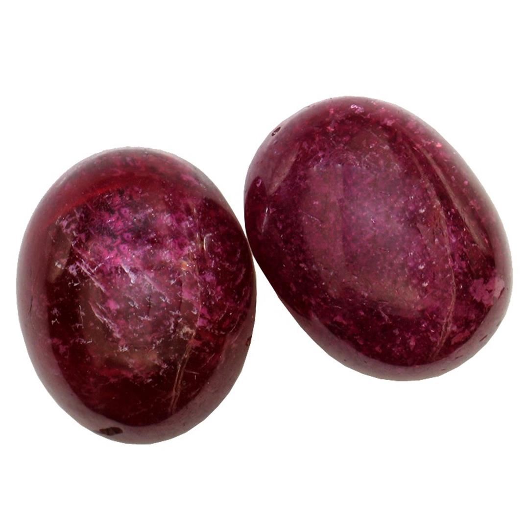 Two oval cabochon cut natural rubies, measuring 12.50 x 10.50 x 8.00mm, exact total weight 20.84ct., clarity is heavily included, type II, dark, very slightly brownish, slightly purplish red color, (GIA slpR 7/3), cut is good. Transmitting light diffusely, translucent to opaque. Naturally occurring internal & external characteristics are present. Indications of laboratory high temperature heat treatment, with glass & flux additives. Ruby has a low tolerance to rhodium plating, repolishing the surface & ultrasonic cleaning. Westfield Appraised at $2,890.00.