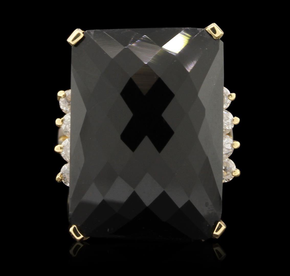 14KT Yellow Gold 20.92ct Black Onyx and Diamond Ring A6492. good Condition! TR855HZ. One electronically tested 14KT yellow gold ladies cast black onyx & diamond ring with a bright polish finish. The featured black onyx is accented with diamonds on either sides, supported by diamond set split shoulders and completed by a two and one-half millimeter wide band. Identified with markings of "K14". Condition is good. Containing: One prong set rectangular modified brilliant cut natural black onyx, measuring 21.80 x 15.90 x 7.30mm, 6%. bulge factor, approximate weight of 20.92ct., clarity is severely included, black, strong, black color, (GIA Bl 10/5), cut is good. Transmitting light very diffusely, opaque. Naturally occurring internal & external characteristics are present. Graded in the setting.Eight prong set round brilliant cut diamonds, measuring 2.60 - 2.50 x 1.53mm (depth est.) approximate. Total Weight of 8 Stones = 0.58ct. Graded in the setting. Clarity: I-2 to I-3 . Color: I - K. Total Weight of Colored Stones 20.92ct.. Total Weight of Diamonds 0.58ct. AIG Appraised at $2,465.00. AIG Appraised.