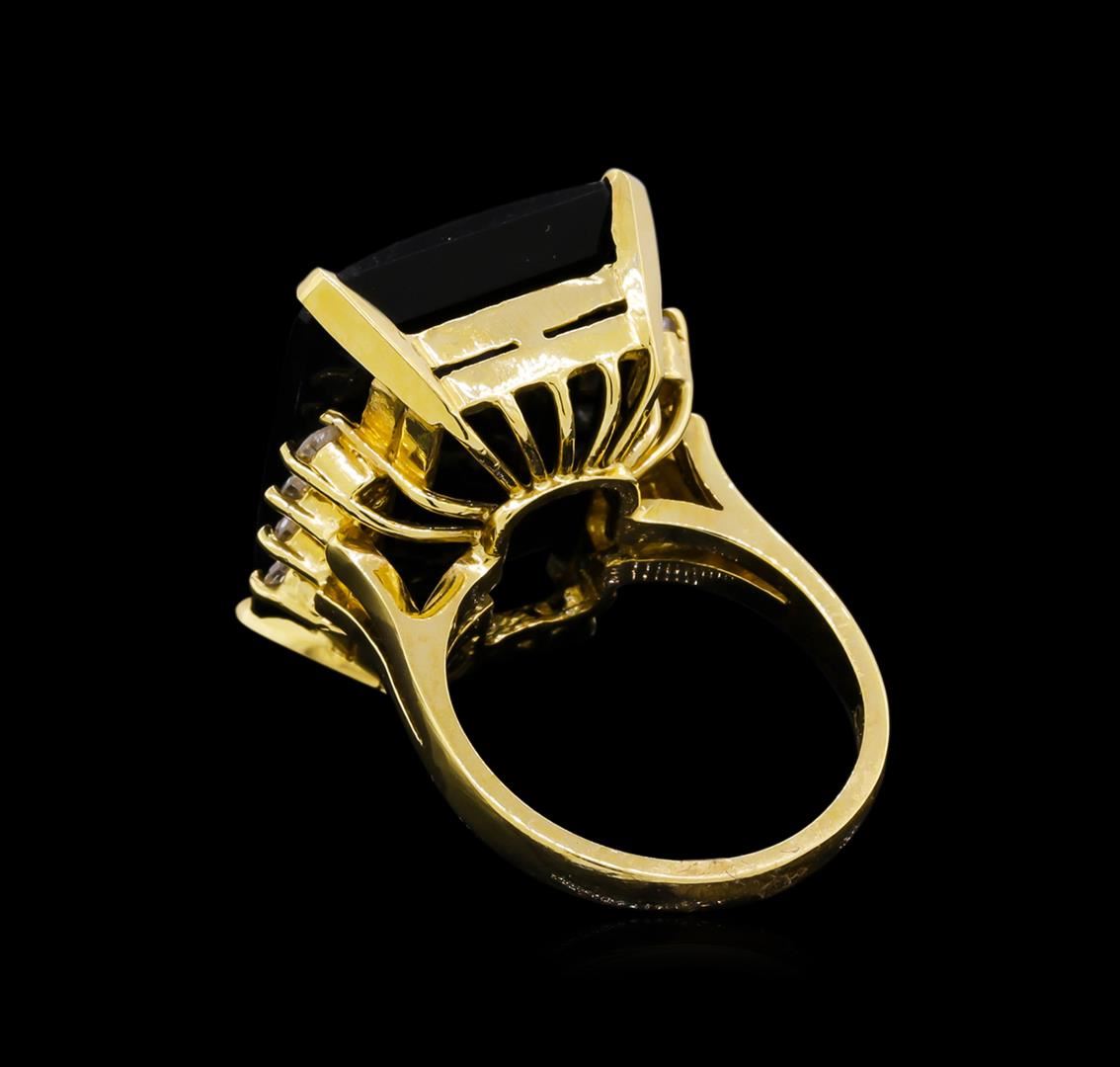 14KT Yellow Gold 20.92ct Black Onyx and Diamond Ring A6492. good Condition! TR855HZ. One electronically tested 14KT yellow gold ladies cast black onyx & diamond ring with a bright polish finish. The featured black onyx is accented with diamonds on either sides, supported by diamond set split shoulders and completed by a two and one-half millimeter wide band. Identified with markings of "K14". Condition is good. Containing: One prong set rectangular modified brilliant cut natural black onyx, measuring 21.80 x 15.90 x 7.30mm, 6%. bulge factor, approximate weight of 20.92ct., clarity is severely included, black, strong, black color, (GIA Bl 10/5), cut is good. Transmitting light very diffusely, opaque. Naturally occurring internal & external characteristics are present. Graded in the setting.Eight prong set round brilliant cut diamonds, measuring 2.60 - 2.50 x 1.53mm (depth est.) approximate. Total Weight of 8 Stones = 0.58ct. Graded in the setting. Clarity: I-2 to I-3 . Color: I - K. Total Weight of Colored Stones 20.92ct.. Total Weight of Diamonds 0.58ct. AIG Appraised at $2,465.00. AIG Appraised.