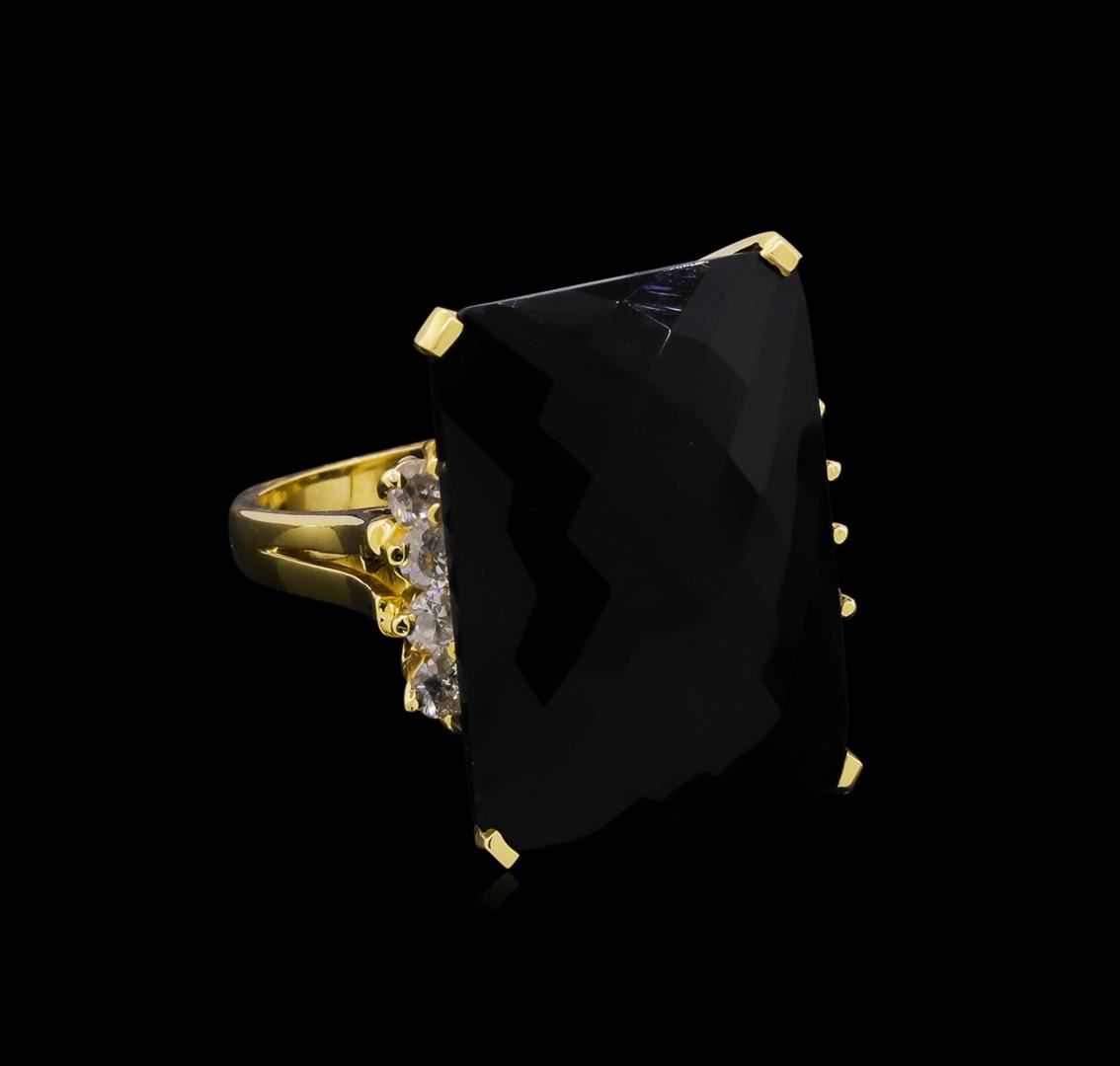 One electronically tested 14KT yellow gold ladies cast black onyx & diamond ring with a bright polish finish. The featured black onyx is accented with diamonds on either sides, supported by diamond set split shoulders and completed by a two and one-half millimeter wide band. Identified with markings of "K14". Condition is good. Containing: One prong set rectangular modified brilliant cut natural black onyx, measuring 21.80 x 15.90 x 7.30mm, 6%. bulge factor, approximate weight of 20.92ct., clarity is severely included, black, strong, black color, (GIA Bl 10/5), cut is good. Transmitting light very diffusely, opaque. Naturally occurring internal & external characteristics are present. Graded in the setting.Eight prong set round brilliant cut diamonds, measuring 2.60 - 2.50 x 1.53mm (depth est.) approximate. Total Weight of 8 Stones = 0.58ct. Graded in the setting. Clarity: I-2 to I-3 . Color: I - K. Total Weight of Colored Stones 20.92ct.. Total Weight of Diamonds 0.58ct. AIG Appraised at $2,465.00. AIG Appraised at $2,465.00.