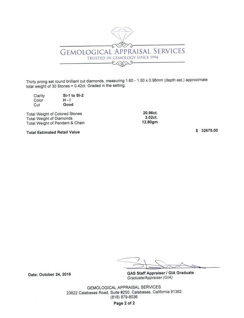 One electronically tested 14KT white gold lady's combination cast & assembled fashion pendant & chain 20.0' long, 1.1mm round cable link with a spring ring clasp with a double basket halo with a bright polish with milgrain detailing finish. Identified with markings of '14K'. Condition is new, good workmanship. Containing: One prong set oval modified brilliant cut natural tanzanite, measuring 20.13 x 13.51 x 10.61mm, (depth est.) 3%. bulge factor, approximate weight of 20.96ct., clarity is eye clean, medium dark, strong, violetish blue color, (GIA vB 6/5), cut is very good. Transmitting light with no distortion, transparent. Colored gemstones are presumed to have been subjected to commonly used enhancement processes. Graded loose prior to setting in the GIA Laboratory, Report #2173847671. Thirteen prong set round brilliant cut diamonds, measuring 3.20 - 3.00 x 1.86mm (depth est.) approximate total weight of 13 Stones = 1.41ct. Graded in the setting. Clarity SI-1 to I-1. Color: H - I Cut Good Twelve prong set round brilliant cut diamonds, measuring 2.80 - 2.70 x 1.71mm (depth est.) approximate total weight of 12 Stones = 0.95ct. Graded in the setting. Clarity SI-1 to SI-2. Color: H - I Cut Good Twelve prong set round brilliant cut diamonds, measuring 1.80 - 1.70 x 1.09mm (depth est.) approximate total weight of 12 Stones = 0.24ct. Graded in the setting. Clarity SI-1 to SI-3. Color: H - I Cut Good Thirty prong set round brilliant cut diamonds, measuring 1.60 - 1.50 x 0.96mm (depth est.) approximate total weight of 30 Stones = 0.42ct. Graded in the setting. Clarity SI-1 to SI-2. Color: H - I Cut Good. Total Weight of Colored Stones 20.96ct.. Total Weight of Diamonds 3.02ct.. Total Weight of Pendant & Chain 12.80gm. GAS Appraised at $32,675.00.