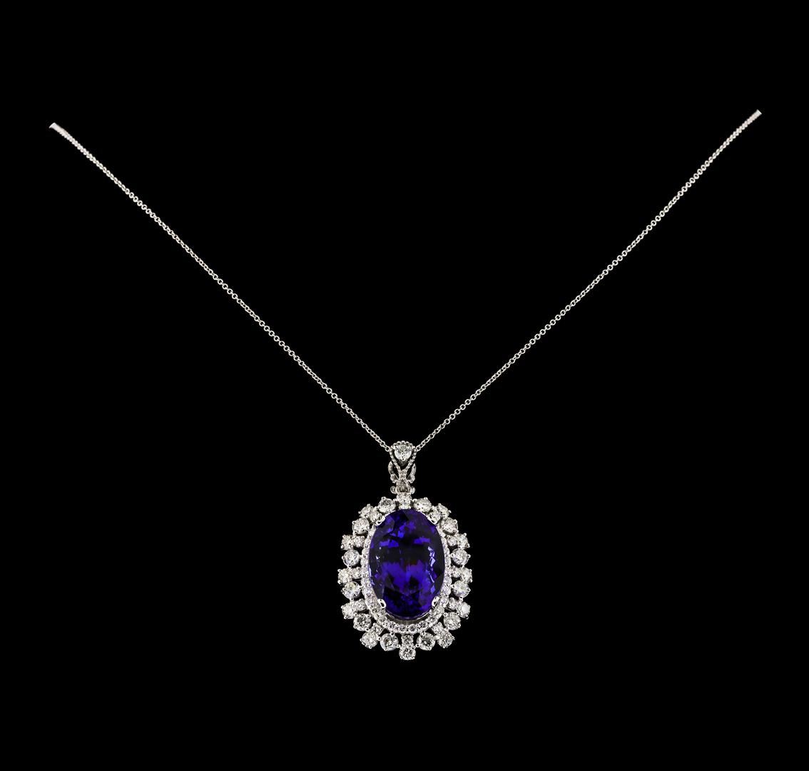 One electronically tested 14KT white gold lady's combination cast & assembled fashion pendant & chain 20.0' long, 1.1mm round cable link with a spring ring clasp with a double basket halo with a bright polish with milgrain detailing finish. Identified with markings of '14K'. Condition is new, good workmanship. Containing: One prong set oval modified brilliant cut natural tanzanite, measuring 20.13 x 13.51 x 10.61mm, (depth est.) 3%. bulge factor, approximate weight of 20.96ct., clarity is eye clean, medium dark, strong, violetish blue color, (GIA vB 6/5), cut is very good. Transmitting light with no distortion, transparent. Colored gemstones are presumed to have been subjected to commonly used enhancement processes. Graded loose prior to setting in the GIA Laboratory, Report #2173847671. Thirteen prong set round brilliant cut diamonds, measuring 3.20 - 3.00 x 1.86mm (depth est.) approximate total weight of 13 Stones = 1.41ct. Graded in the setting. Clarity SI-1 to I-1. Color: H - I Cut Good Twelve prong set round brilliant cut diamonds, measuring 2.80 - 2.70 x 1.71mm (depth est.) approximate total weight of 12 Stones = 0.95ct. Graded in the setting. Clarity SI-1 to SI-2. Color: H - I Cut Good Twelve prong set round brilliant cut diamonds, measuring 1.80 - 1.70 x 1.09mm (depth est.) approximate total weight of 12 Stones = 0.24ct. Graded in the setting. Clarity SI-1 to SI-3. Color: H - I Cut Good Thirty prong set round brilliant cut diamonds, measuring 1.60 - 1.50 x 0.96mm (depth est.) approximate total weight of 30 Stones = 0.42ct. Graded in the setting. Clarity SI-1 to SI-2. Color: H - I Cut Good. Total Weight of Colored Stones 20.96ct.. Total Weight of Diamonds 3.02ct.. Total Weight of Pendant & Chain 12.80gm. GAS Appraised at $32,675.00.