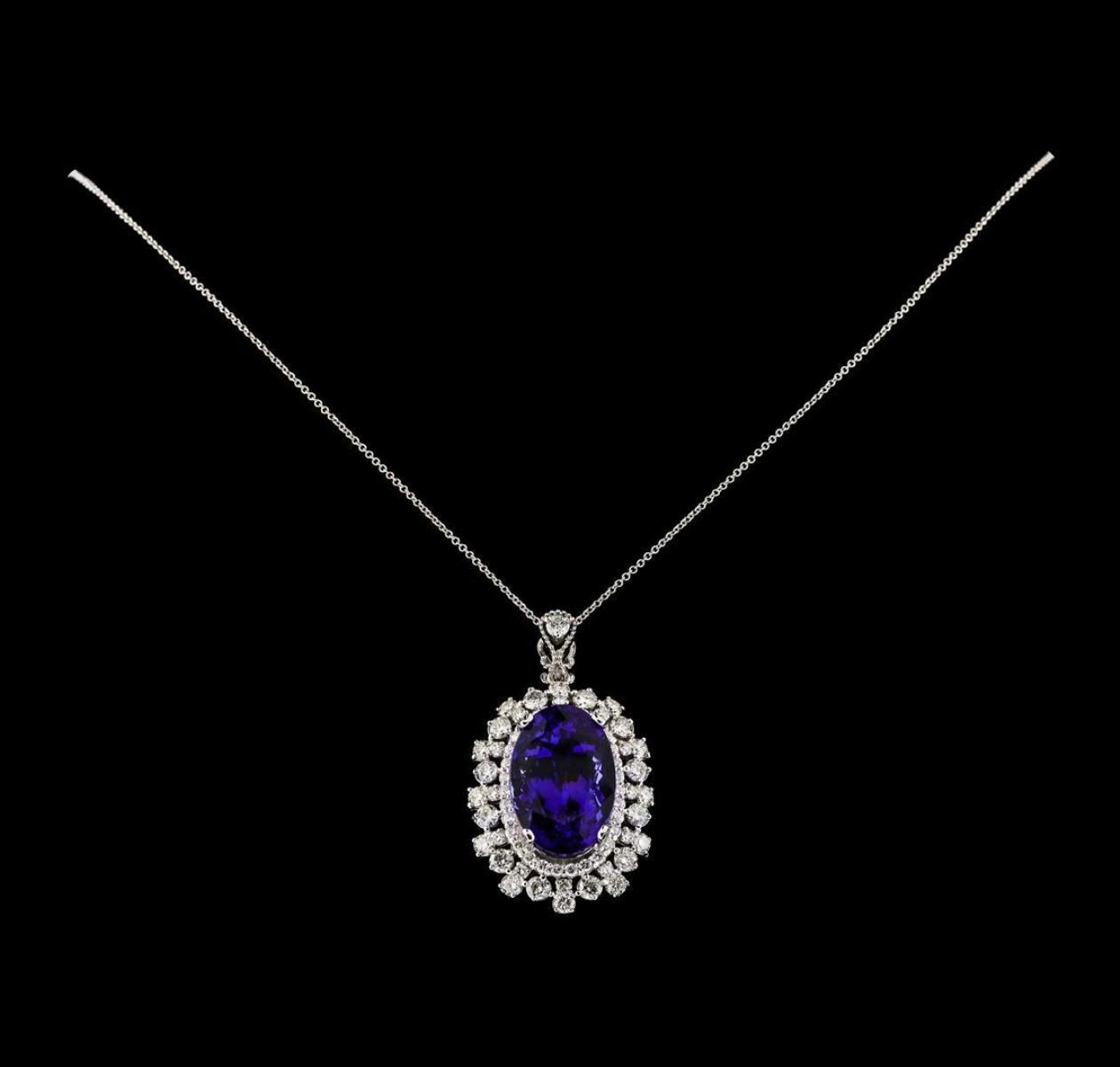 One electronically tested 14KT white gold lady's combination cast & assembled fashion pendant & chain 20.0' long, 1.1mm round cable link with a spring ring clasp with a double basket halo with a bright polish with milgrain detailing finish. Identified with markings of '14K'. Condition is new, good workmanship. Containing: One prong set oval modified brilliant cut natural tanzanite, measuring 20.13 x 13.51 x 10.61mm, (depth est.) 3%. bulge factor, approximate weight of 20.96ct., clarity is eye clean, medium dark, strong, violetish blue color, (GIA vB 6/5), cut is very good. Transmitting light with no distortion, transparent. Colored gemstones are presumed to have been subjected to commonly used enhancement processes. Graded loose prior to setting in the GIA Laboratory, Report #2173847671. Thirteen prong set round brilliant cut diamonds, measuring 3.20 - 3.00 x 1.86mm (depth est.) approximate total weight of 13 Stones = 1.41ct. Graded in the setting. Clarity SI-1 to I-1. Color: H - I Cut Good Twelve prong set round brilliant cut diamonds, measuring 2.80 - 2.70 x 1.71mm (depth est.) approximate total weight of 12 Stones = 0.95ct. Graded in the setting. Clarity SI-1 to SI-2. Color: H - I Cut Good Twelve prong set round brilliant cut diamonds, measuring 1.80 - 1.70 x 1.09mm (depth est.) approximate total weight of 12 Stones = 0.24ct. Graded in the setting. Clarity SI-1 to SI-3. Color: H - I Cut Good Thirty prong set round brilliant cut diamonds, measuring 1.60 - 1.50 x 0.96mm (depth est.) approximate total weight of 30 Stones = 0.42ct. Graded in the setting. Clarity SI-1 to SI-2. Color: H - I Cut Good. Total Weight of Colored Stones 20.96ct.. Total Weight of Diamonds 3.02ct.. Total Weight of Pendant & Chain 12.80gm. GAS Appraised.