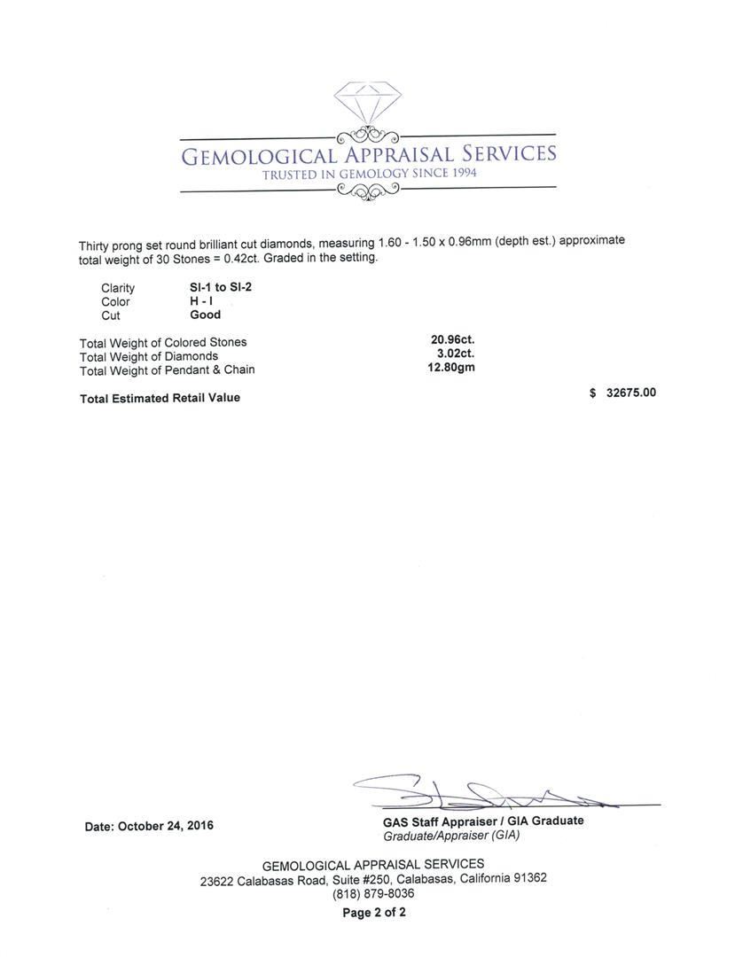 One electronically tested 14KT white gold lady's combination cast & assembled fashion pendant & chain 20.0' long, 1.1mm round cable link with a spring ring clasp with a double basket halo with a bright polish with milgrain detailing finish. Identified with markings of '14K'. Condition is new, good workmanship. Containing: One prong set oval modified brilliant cut natural tanzanite, measuring 20.13 x 13.51 x 10.61mm, (depth est.) 3%. bulge factor, approximate weight of 20.96ct., clarity is eye clean, medium dark, strong, violetish blue color, (GIA vB 6/5), cut is very good. Transmitting light with no distortion, transparent. Colored gemstones are presumed to have been subjected to commonly used enhancement processes. Graded loose prior to setting in the GIA Laboratory, Report #2173847671. Thirteen prong set round brilliant cut diamonds, measuring 3.20 - 3.00 x 1.86mm (depth est.) approximate total weight of 13 Stones = 1.41ct. Graded in the setting. Clarity SI-1 to I-1. Color: H - I Cut Good Twelve prong set round brilliant cut diamonds, measuring 2.80 - 2.70 x 1.71mm (depth est.) approximate total weight of 12 Stones = 0.95ct. Graded in the setting. Clarity SI-1 to SI-2. Color: H - I Cut Good Twelve prong set round brilliant cut diamonds, measuring 1.80 - 1.70 x 1.09mm (depth est.) approximate total weight of 12 Stones = 0.24ct. Graded in the setting. Clarity SI-1 to SI-3. Color: H - I Cut Good Thirty prong set round brilliant cut diamonds, measuring 1.60 - 1.50 x 0.96mm (depth est.) approximate total weight of 30 Stones = 0.42ct. Graded in the setting. Clarity SI-1 to SI-2. Color: H - I Cut Good. Total Weight of Colored Stones 20.96ct.. Total Weight of Diamonds 3.02ct.. Total Weight of Pendant & Chain 12.80gm. GAS Appraised.