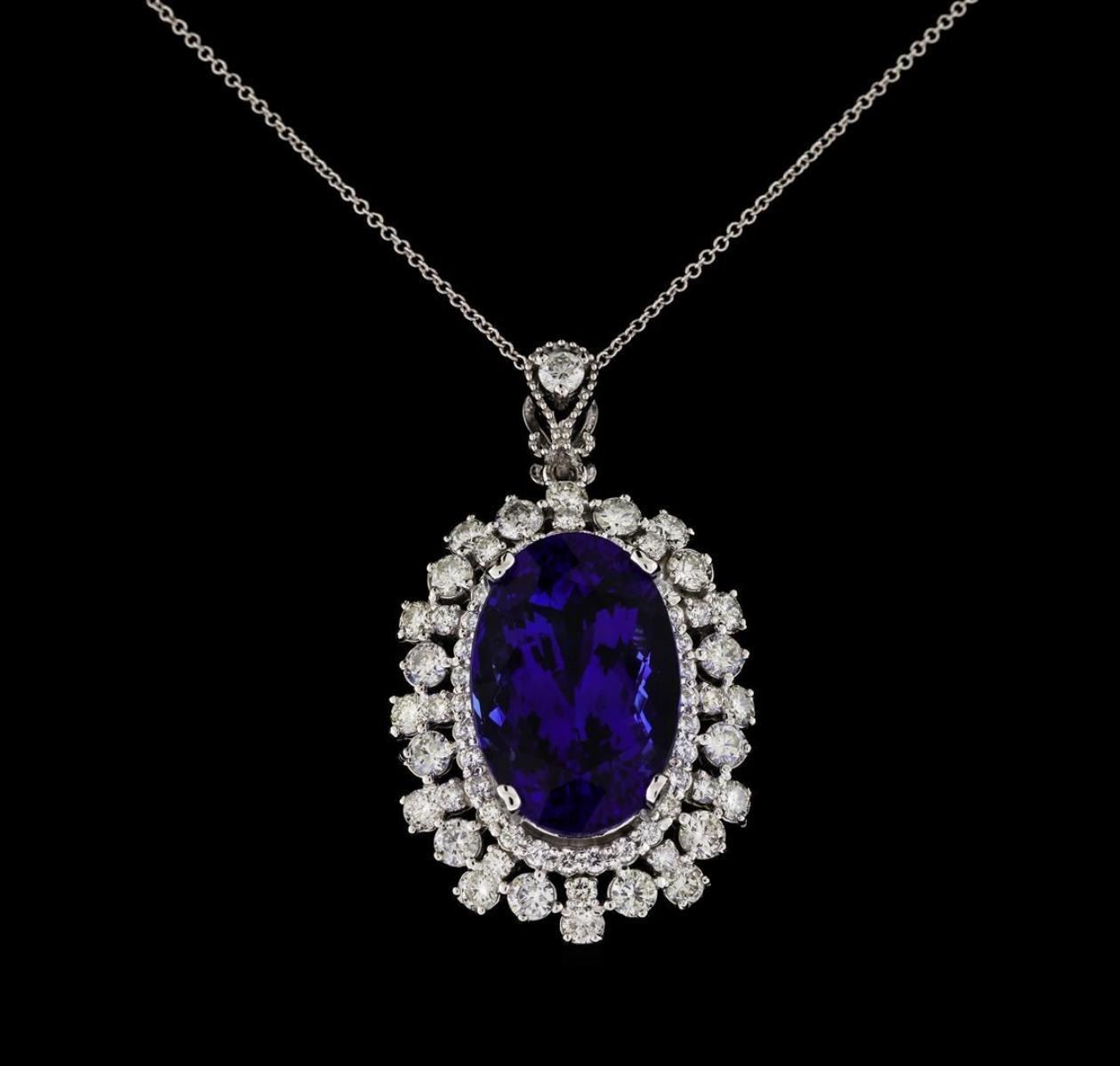 One electronically tested 14KT white gold lady's combination cast & assembled fashion pendant & chain 20.0' long, 1.1mm round cable link with a spring ring clasp with a double basket halo with a bright polish with milgrain detailing finish. Identified with markings of '14K'. Condition is new, good workmanship. Containing: One prong set oval modified brilliant cut natural tanzanite, measuring 20.13 x 13.51 x 10.61mm, (depth est.) 3%. bulge factor, approximate weight of 20.96ct., clarity is eye clean, medium dark, strong, violetish blue color, (GIA vB 6/5), cut is very good. Transmitting light with no distortion, transparent. Colored gemstones are presumed to have been subjected to commonly used enhancement processes. Graded loose prior to setting in the GIA Laboratory, Report #2173847671. Thirteen prong set round brilliant cut diamonds, measuring 3.20 - 3.00 x 1.86mm (depth est.) approximate total weight of 13 Stones = 1.41ct. Graded in the setting. Clarity SI-1 to I-1. Color: H - I Cut Good Twelve prong set round brilliant cut diamonds, measuring 2.80 - 2.70 x 1.71mm (depth est.) approximate total weight of 12 Stones = 0.95ct. Graded in the setting. Clarity SI-1 to SI-2. Color: H - I Cut Good Twelve prong set round brilliant cut diamonds, measuring 1.80 - 1.70 x 1.09mm (depth est.) approximate total weight of 12 Stones = 0.24ct. Graded in the setting. Clarity SI-1 to SI-3. Color: H - I Cut Good Thirty prong set round brilliant cut diamonds, measuring 1.60 - 1.50 x 0.96mm (depth est.) approximate total weight of 30 Stones = 0.42ct. Graded in the setting. Clarity SI-1 to SI-2. Color: H - I Cut Good. Total Weight of Colored Stones 20.96ct.. Total Weight of Diamonds 3.02ct.. Total Weight of Pendant & Chain 12.80gm. GAS Appraised.
